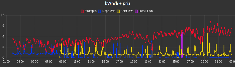 Slik ser siste mnd ut hos meg: Har for tiden litt for liten batterikapasitet til at jeg kan benytte solkraft døgnet rundt men å legge batterilading med kjøpestrøm til de minst dyre timene er i alle fall gunstig. De første 7-8 dagene i bildet her er med solcelleanlegget ute av drift. Data er lagret time for time i MariaDB SQL server og hentet ut i NodeRed Dashboard.1 poeng