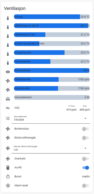 Jeg har i noen tid nå hatt en HA nummer 2 kjørende på en RPi Zero. Denne har jeg hatt et lite ønske om å terminere fordi HA ikke lenger er støttet på en så svak "dings". Jeg brukte den kun for å lese inn data fra ventilasjonsanlegget via modbus og publisere dette på MQTT og det har fungert rimelig greit. Men så fikk esphome plutselig støtte for modbus den også og da ble det til at jeg tenkte enda mer alvorlig på dette. Esphome viste seg å være like lett å sette opp til å lese modbus som det meste annet som er enkelt med esphome. Kan varmt anbefales. Hardware kostet meg ca 100kr hos artigereliv.no Det gjenstår å finne en egnet boks å ha kretskortene i....... esphome: name: ventilasjon platform: ESP32 board: esp-wrover-kit wifi: ssid: "HEIME5.ORG" password: !secret heime_wifi domain: .lan preferences: flash_write_interval: 48h # Enable fallback hotspot (captive portal) in case wifi connection fails #ap: # ssid: "Stue Co2 Fallback Hotspot" # password: "ppHXTW3jIUEL" #captive_portal: # Enable logging logger: level: DEBUG baud_rate: 0 # Enable Home Assistant API api: ota: uart: id: mod_uart tx_pin: 17 rx_pin: 16 baud_rate: 9600 stop_bits: 1 modbus: id: modbus1 uart_id: mod_uart flow_control_pin: 5 send_wait_time: 1000ms modbus_controller: - id: heru ## the Modbus device addr address: 1 modbus_id: modbus1 command_throttle: 1000ms update_interval: 10s switch: - platform: modbus_controller modbus_controller_id: heru register_type: coil address: 3 name: "ventilation_away_mode" - platform: modbus_controller modbus_controller_id: heru register_type: coil address: 4 name: "ventilation_alarm_reset" - platform: modbus_controller modbus_controller_id: heru register_type: coil address: 2 name: "ventilation_boost_mode" - platform: modbus_controller modbus_controller_id: heru register_type: coil address: 1 name: "ventilation_overpressure_mode" - platform: modbus_controller modbus_controller_id: heru register_type: coil address: 0 name: "ventilation_unit_on" select: - platform: modbus_controller name: "ventilation_boost_speed" address: 25 value_type: U_WORD optionsmap: "Høy": 4 "Lav": 3 - platform: modbus_controller name: "ventilation_electric_heater_connected" address: 50 value_type: U_WORD optionsmap: "Tilkoblet": 1 "Frakoblet": 0 sensor: - platform: modbus_controller modbus_controller_id: heru name: "ventilation_outdoor_temperature" register_type: read address: 1 value_type: S_WORD unit_of_measurement: "°C" device_class: temperature accuracy_decimals: 1 filters: - multiply: 0.1 - or: - throttle: 30min - delta: 2.0 - platform: modbus_controller modbus_controller_id: heru name: "ventilation_supply_air_temperature" register_type: read address: 2 value_type: S_WORD unit_of_measurement: "°C" device_class: temperature accuracy_decimals: 1 filters: - multiply: 0.1 - or: - throttle: 30min - delta: 2.0 - platform: modbus_controller modbus_controller_id: heru name: "ventilation_exhaust_air_temperature" register_type: read address: 3 value_type: S_WORD unit_of_measurement: "°C" device_class: temperature accuracy_decimals: 1 filters: - multiply: 0.1 - or: - throttle: 30min - delta: 2.0 - platform: modbus_controller modbus_controller_id: heru name: "ventilation_waste_air_temperature" register_type: read address: 4 value_type: S_WORD unit_of_measurement: "°C" device_class: temperature accuracy_decimals: 1 filters: - multiply: 0.1 - or: - throttle: 30min - delta: 2.0 - platform: modbus_controller modbus_controller_id: heru name: "ventilation_heat_recovery_wheel_temperature" register_type: read address: 6 value_type: S_WORD unit_of_measurement: "°C" device_class: temperature accuracy_decimals: 1 filters: - multiply: 0.1 - or: - throttle: 30min - delta: 2.0 - platform: modbus_controller modbus_controller_id: heru name: "ventilation_current_supply_fan_speed" register_type: read address: 26 value_type: S_WORD unit_of_measurement: "rpm" filters: - or: - throttle: 30min - delta: 50.0 - platform: modbus_controller modbus_controller_id: heru name: "ventilation_current_exhaust_fan_speed" register_type: read address: 27 value_type: S_WORD unit_of_measurement: "rpm" filters: - or: - throttle: 30min - delta: 50.0 - platform: modbus_controller modbus_controller_id: heru name: "ventilation_current_heating_power" register_type: read address: 28 value_type: S_WORD unit_of_measurement: "W" filters: - multiply: 6.6667 - or: - throttle: 30min - delta: 5.0 - platform: modbus_controller modbus_controller_id: heru name: "ventilation_current_heat_cold_recovery_power" register_type: read address: 29 value_type: S_WORD unit_of_measurement: "%" filters: - multiply: 0.3921569 - or: - throttle: 30min - delta: 5.0 number: - platform: modbus_controller modbus_controller_id: heru name: "ventilation_temperature_setpoint" register_type: holding address: 1 value_type: S_WORD unit_of_measurement: "°C" min_value: 15 max_value: 30 binary_sensor: - platform: modbus_controller modbus_controller_id: heru name: "ventilation_exhaust_fan_alarm" register_type: discrete_input address: 21 - platform: modbus_controller modbus_controller_id: heru name: "ventilation_exhaust_filter_alarm" register_type: discrete_input address: 23 - platform: modbus_controller modbus_controller_id: heru name: "ventilation_filter_timer_alarm" register_type: discrete_input address: 24 - platform: modbus_controller modbus_controller_id: heru name: "ventilation_freeze_alarm" register_type: discrete_input address: 12 - platform: modbus_controller modbus_controller_id: heru name: "ventilation_freeze_protection_a_level" register_type: discrete_input address: 26 - platform: modbus_controller modbus_controller_id: heru name: "ventilation_freeze_protection_b_level" register_type: discrete_input address: 25 - platform: modbus_controller modbus_controller_id: heru name: "ventilation_low_rotor_temperature_alarm" register_type: discrete_input address: 14 - platform: modbus_controller modbus_controller_id: heru name: "ventilation_low_supply_alarm" register_type: discrete_