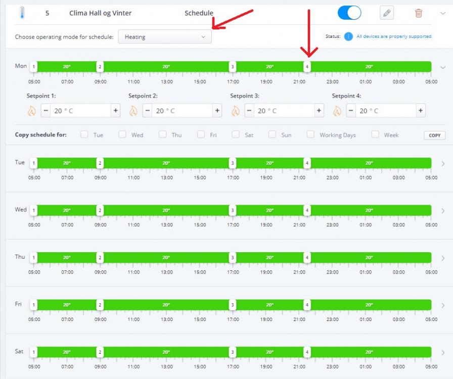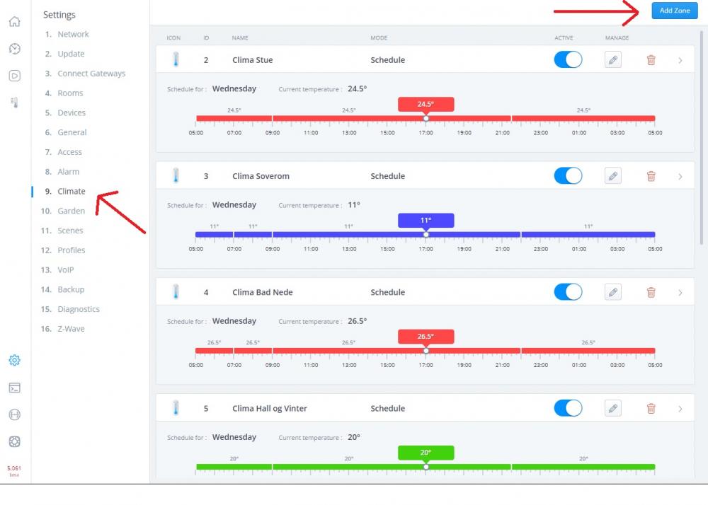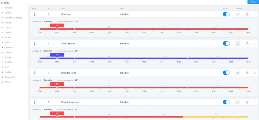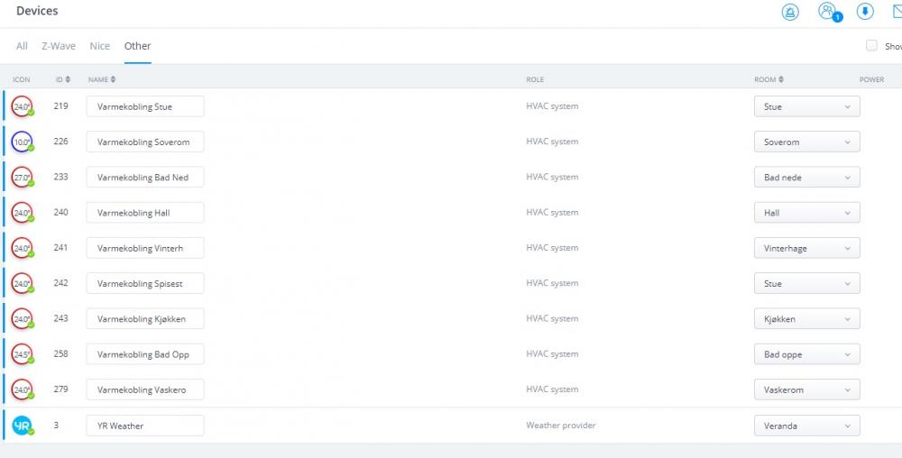Det er mange spørsmål rundt Z-Water og hvordan denne settes opp, fungerer, hvilken komponenter som er brukt osv. Jeg fant ikke så mye info om oppsett av Z-Water i Home Center 3 (HC3) inne på dette forumet, og når det er 18 minus ute når en konfigurer nytt oppsett, så er det greit at oppsettet virker rimelig kjapt 🙂 Jeg har hatt dette systemet gående i nesten 2 år med Home Center Lite (HCL) uten feilslag og har oppgradert til HC3 da HCL ikke klarte å snurre rundt noe mer med mine komponenter. Det var selvforklarende og enkelt å sette opp varmestyring i HCL med paneler, ikke fullt så selvforklarende å sette opp i HC3, men enkelt når en første vet hvordan det gjøres 😁 Jeg benytter ikke romtermostater i mitt system da det er meningsløst med vannbåren varme, så der er det å prøve seg frem med temperatursettings over tid og bli enig i hva som er riktig temp. Nattsenk av temp har jeg prøvd med 1 grad ned, start kl 2130 og opp igjen med 1 grad kl 0430. Med 17 minusgrader ute så klager kona på at det er huskaldt om morran, og det er minimalt å spare med å senke temp med 1 grad i 6 timer, så nå står systemet med konstant temp. Jeg bruker Fibaro Multisensor eller Aeotec Multisensor 6 for å måle temp i hvert enkelt rom og det fungerer utmerket, vi har en stabil og jevn temperatur. En må ta høyde for at sensoren sitter oppe i taket og ikke i hodehøyde når en setter temperaturen, det er hakket varmere «der oppe» Kobling av Z-Water er gjort som på bildet under (bilde 0 og 1), jeg er ikke ekspert på slik, så jeg sendte koblingsskjema til en elektrikerkompis som svarte med «å ja, sånn ja, du trenger det ja, kommer i morgen» Som sagt, som gjort, dagen etter var det koblet og har fungert perfekt siden. Når Z-water er fysisk koblet så sett HC3 i læringsmodus og trykk 1 gang på inclusion knappen med en binders eller noe annet tynt. Den vil da dukke opp i Device lista, navngi de forskjellige sonene du trenger. (bilde 2) Så må du lage en kobling mellom tempsensor og z-water utgangen. Dette gjøres ved å «add device» under other (ikke z-wave) Trykk på «Thermostat» (bilde 3) Velg temp sensor og z-water. Husk å ta bort krysset for «Hide device….» hvis ikke forsvinner temp sensoren din i lista 🙂 (bilde 4) Da har du en god liste med koblinger i lista under Other (bilde 5) Da er det klart til å gå til kontrollpanelet for å sette opp varmestyring under Settings - 9. Climate. Trykk Add og velg koblingen du laget mellom temp sensor og Z-water (bilde 6) Du skal velge Heating og for å justere temperaturen må du trykke på slideren for 1 av de 4 tidspunktene. Når du har satt opp 1 dag slik du vil ha den er det mulig å kopiere disse innstillingene til resten av dagene. (bilde 7 og 8 ) I mitt tilfelle fungerer denne løsningen som en drøm og jeg har full kontroll på temperaturer i alle rom med varsling hvis temp synker under visse nivå. Før Z-water og Fibaro Home Center ble installert hadde jeg Rothline med romtermostater i alle rom, noe som er bortkastet etter min erfaring. Håper denne lille guiden kan hjelpe andre HC3 brukere med ideer og oppsett. Selv fomlet jeg en del for å finne ut av det da jeg hele tiden tenkte paneler i HCL 🙂 Martin1 poeng