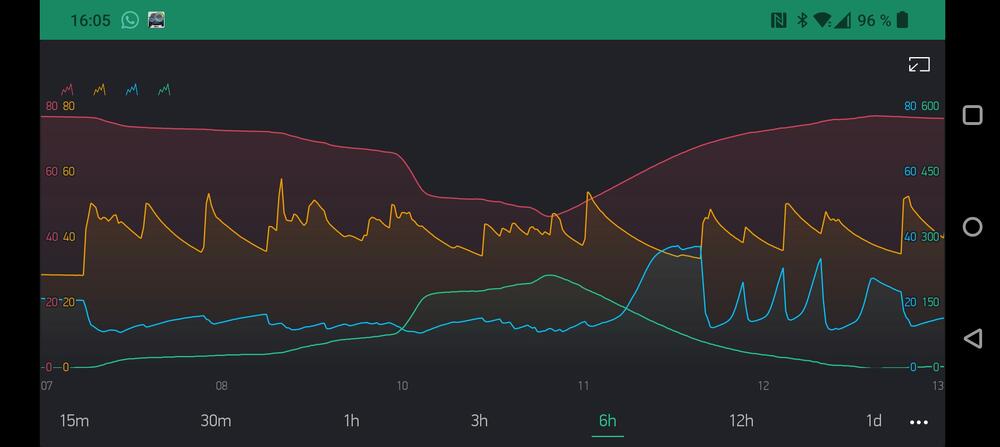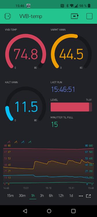 2. Vel nå har ikke jeg noe styring på vvb men skal gjøre det i løpet av oktober, så raskt som deler kommer og elektriker har tid til å komme å montere. Men det jeg har gjort er å lage en overvåking av vvb. Jeg bruker en esp8266 mikrokontroller som sitter på en nodemcu, den programeres med Arduino og bruker en app som heter Blynk til å lese/styre på mobil, sender også temp data til tingspeak en nettbasert logger hovr du kan logge og analysere data. Har 2 ds18b20 temperatur følere. En nede på tanken vedsiden av originale termostaten, en på varmtvann røret og en på kaldtvann røret. De på rørene hadde jeg først passert 10cm fra blandekrana da var begge varme hele tiden. Flytta de til ca 50cm fra blandekrana da ble det litt større variasjon. Har di nå ca 100cm fra blandekrana nå kan man se tydelig svingninger når det brukes varmtvann. Jeg har lenge tenkt på en løsning for å strupe VV når noen dusjer for lenge. Med den Arduino basert mikrokontrolleren og temperatur sensor på vv og kv kan man med ganske stor sikkerhet fastslå når vv blir brukt. Det er fint mulig å lage et regnestykke som beregner når bruken av vv begynner, og starte en timer som aktiverer en ventil som struper vv. Man kan også legge til en reset knapp slik at om flere skal dusje rett etter hverandre så får alle sin tid