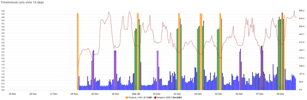 Kult! Jeg gjør noenlunde det samme i mitt oppsett. Ut fra timeprisene beregnes de billigste 1-10 timene i døgnet. Når jeg plugger elbilen til, så henter jeg ladestatus og beregner hvor lang tid det tar å lade opp til ønsket ladenivå. Tar det 6 timer, så aktiveres lading i de 6 billigste timene. For varmtvannstanken, som er av den "dumme" typen, har jeg funnet ut at forbruket er nokså jevnt. Det holder å "lade" den på de 3 billigste timene. Strømprisen i grafen er inkl. mva, påslag fra leverandør og forbruksledd. Slik ser resultatet ut for de siste 10 dagene: Dagens billigste timer fordelte seg slik:2 poeng