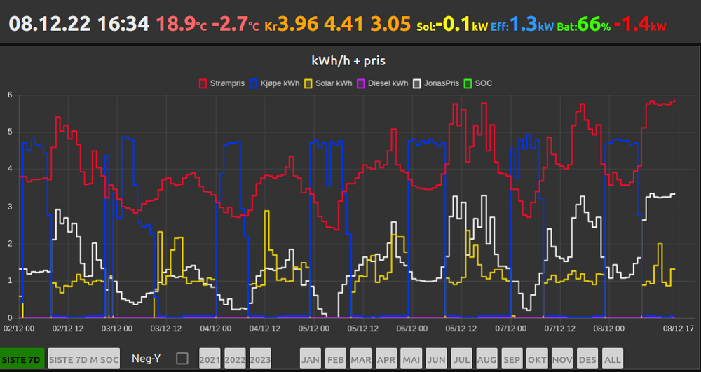 Da har jeg falt ned på en strategi for noenlunde automatisk strømkjøp. Kort forklart så går det slik: Ta vare på strømpriser for i dag og i morgen. Bruk tidsområdet fom kl 16:00 til kl 16:00 i morgen og søk opp de billigste n timer og de billigste nn timer i det intervallet. De billigste n timer (9 i eksempelet) brukes til å kjøpe strøm for direkte forbruk og lavprioriterte laster som varmepumpe. De billigste nn (7 i eksempelet) brukes til batterilading. Strømkjøp starter da automatisk når inneværende time finnes i listen over de utvalgte timer. Kl 16:00 refreshes hele greiene og starter på nytt igjen. Video fra skifte kl 16:00: Den smale lyseblå rammen indikerer inneværende time. Lysegrønn og mørkegrønn ramme indikerer prisgrense for hhv n og nn timer basert på Jonaspris (råpris + nettleie - strømstøtte) De 2 tabellene til venstre viser de utvalgte timene. Så langt ser det ut til å funke supert: Blå er strømkjøp Rød/hvit er strømpris hhv rå- og jonaspris. Gul er forbruk i huset (blir negativ i grafen når batteriene lades, viser som positiv ellers).1 poeng