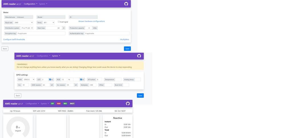 Hei Er det noen som enkelt kan si hvorfor HAN ikke blir grønn hos meg. Jeg har forsøkt å lukke og åpne HAN på nytt. Den står fremdeles åpen hos Lede. Under GPIO settings har jeg verdier som kan sees i vedlegget, noe her som må endres? Jeg har ikke endret noen verdier her til nå. Jeg har sammenliknet mine verdier med verdier fra en annen POW-U i "nabolaget", der er Vcc, GND og Vcc Resistor alle blanke. Edit: Endret GPIO12 til GPIO16 Hardware profil var ikke oppdatert, så det ble feil når jeg valgte dette under ny konfigurering. Hardware profil er fikset i firmware 2.1.81 poeng
