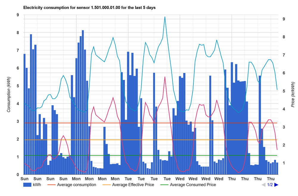 I disse dagene med ekstreme prisvariasjoner er det nok smartere å bruke mer strøm i de timene strømprisene er lavest enn å optimalisere for lavest effektledd. Prisen på de høyeste timene har typisk ligget på 10x prisen til laveste time. Det kan se slik ut (rød kurve er pris etter beregnet strømstøtte basert på gjennomsnittet for 1-16 desember): Her er effektiv gjennomsnittelig strømpris ca 1,56 kr per kWt inkludert alle avgifter og nettleie etter at strømstøtten er trukket fra. Uten å flytte forbruk hadde nok gjennomsnittet ligget over 1kr høyere per kWt. Med et forbruk på ca 70 kWt per døgn vil det si at et trinn opp på nettleien er spart inn på et par dager.2 poeng