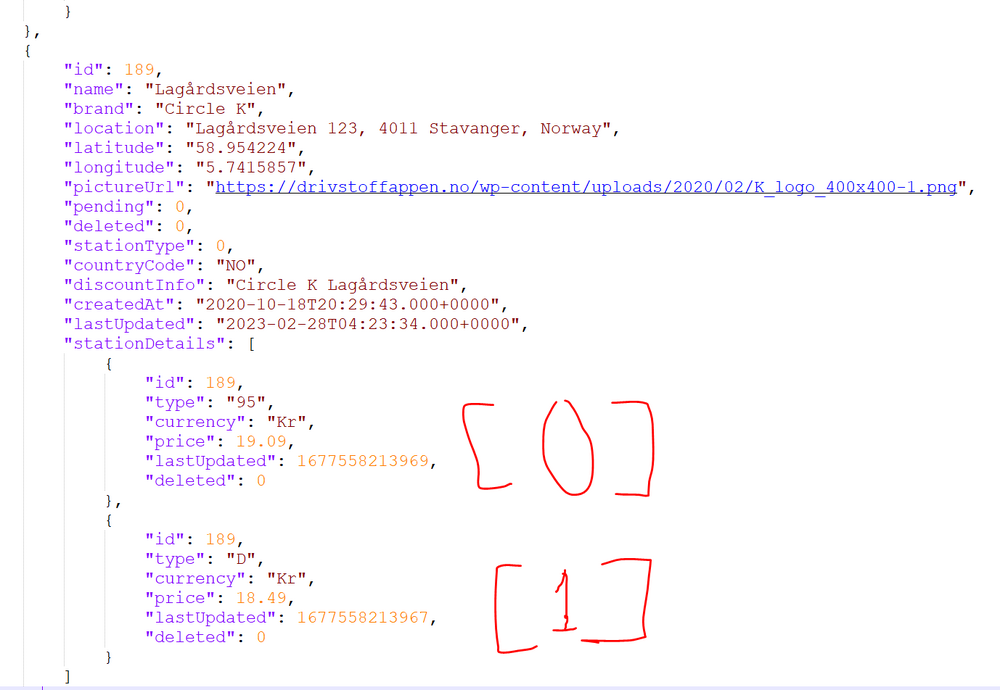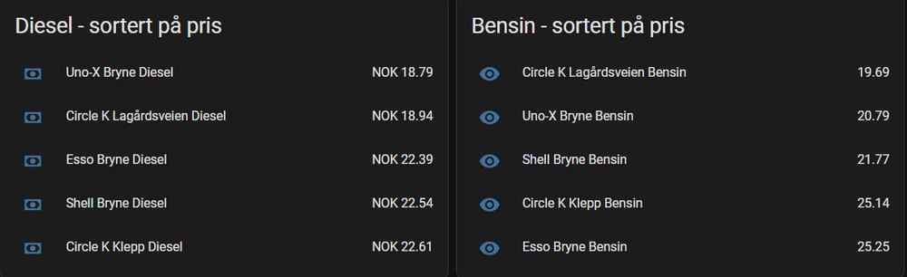 Hei, Her er slik jeg har gjort det, uten bruk av Node-Red etc. Jeg bruker Auto-Entities kortet i HA, og sorterer på pris lavest - høyest. Ett kort for bensin, og ett for diesel. Jeg hadde en del planer for hvordan jeg skulle ha dette, blant annet med bilde som ikon, kart som viste de forskjellige stasjonene, legge inn når den ble sist oppdatert etc.. Tiden strekker dessverre ikke til, så det har blitt lagt på is inntil videre. Anyways, her er det jeg har så langt: I configuration.yaml har jeg lagt inn restsensor som henter stasjoner fra json filen som ble linket til lenger oppe. Tipset for å få den lett leselig er å legge den inn i en JSON formatter, da blir filen mye renere å lese. Edit: Noen ganger når man går inn på JSON filen uten å bruka api-key, får man authorization denied. Da må man bruke Postman API explorer og X-API-KEY for å hente JSON filen. JSON filen ligger vedlagt. Jeg bruker Notepad++ og brukte søkefunksjon for å finne stasjonene jeg vil ha inn i oppsettet. For å legge til stasjonen du ønsker gjør du følgende: 1. Finner stasjonen i JSON filen 2. Kopierer DiscountInfo navnet som du finner i JSON filen 3. endrer 3 ting under rest-sensor i configuration.yaml - Name - Valgfritt navn, men legg merke til at navnet har bensin i seg. Det er fordi value_template henter bensin-prisen - json attributes path discount info må endres til stasjonsnavnet slik den står i JSON filen. - og value_template må endres til samme navnet som du valgte på øverste linje. Under template sensor må du endre navn på sensor (valgfritt), men state_attr må henvise til sensor som du har laget under rest-sensor. Shell bryne diesel henter altså dieselprisen fra sensoren som heter shell bryne bensin... Nedenfor er YAMLkoden for REST og for template sensor. Begge skal i configuration.yaml (ihvertfall hos meg 🙂🙂 ) I RESTsensoren er det name: som sier hva sensoren skal hette, og value_template er verdien til sensoren som blir opprettet. Sensorene som ligger i restsensoren blir da bensinprisen (på grunn av [0] i value template). Hvis det ønskes diesel her så må du sjekke hva som står i JSON fila. [0] er øverste avsnitt, [1] blir neste osv.. Se utklipp nedenfor, kanskje det ga mer mening. configuration.yaml rest: - scan_interval: 600 method: GET headers: Content-Type: application/json X-API-KEY: 2CD114509703F6E0A976C32FCB79C4F62966EEC6 User-Agent: Drivstoffappen/1.3.8 (com.raskebiler.drivstoff.appen; build:130; iOS 15.2.1) Alamofire/5.4.4 Accept-Language: nb-NO;q=1.0, en-GB;q=0.9 Accept-Encoding: br;q=1.0, gzip;q=0.9, deflate;q=0.8 Connection: keep-alive resource: https://api.drivstoffappen.no/api/stations?stationType=0&countryCode=NO sensor: - name: "Shell Bryne Bensin" json_attributes_path: "$..[?(@.discountInfo=='Shell Bryne')]" value_template: "{{ state_attr('sensor.shell_bryne_bensin', 'stationDetails')[0].price }}" force_update: true json_attributes: - "id" - "location" - "latitude" - "longitude" - "pictureUrl" - "discountInfo" - "lastUpdated" - "stationDetails" - name: "Circle K Lagårdsveien Bensin" json_attributes_path: "$..[?(@.discountInfo=='Circle K Lagårdsveien')]" force_update: true value_template: "{{ state_attr('sensor.circle_k_lagardsveien_bensin', 'stationDetails')[0].price }}" json_attributes: - "id" - "location" - "latitude" - "longitude" - "pictureUrl" - "discountInfo" - "lastUpdated" - "stationDetails" - name: "Uno-X Bryne Bensin" json_attributes_path: "$..[?(@.discountInfo=='Uno-X Bryne')]" force_update: true value_template: "{{ state_attr('sensor.uno_x_bryne_bensin', 'stationDetails')[0].price }}" json_attributes: - "id" - "location" - "latitude" - "longitude" - "pictureUrl" - "discountInfo" - "lastUpdated" - "stationDetails" - name: "Esso Bryne Bensin" json_attributes_path: "$..[?(@.discountInfo=='Esso Bryne')]" force_update: true value_template: "{{ state_attr('sensor.esso_bryne_bensin', 'stationDetails')[0].price }}" json_attributes: - "id" - "location" - "latitude" - "longitude" - "pictureUrl" - "discountInfo" - "lastUpdated" - "stationDetails" - name: "Circle K Klepp Bensin" json_attributes_path: "$..[?(@.discountInfo=='Circle K Klepp')]" force_update: true value_template: "{{ state_attr('sensor.circle_k_klepp_bensin', 'stationDetails')[0].price }}" json_attributes: - "id" - "location" - "latitude" - "longitude" - "pictureUrl" - "discountInfo" - "lastUpdated" - "stationDetails" For å lage diesel sensorene er det hentet samme sensor, men brukt neste avsnitt i JSON fila ( [1] ). Noen ganger har stasjonene avgiftsfri diesel eller 98 bensin på 2. avsnitt, så da må det brukes [2] eller [3] alt etter hvordan JSON ser ut på aktuell stasjon. Merk at sensorene henter attribut fra sensor.shell_bryne_bensin. Det er fordi i restsensoren henter vi bensinprisen, og hele stasjonen som vi henter inn i HA blir da kalt for shell bryne bensin. For å hente dieselpris bruker vi altså attribute under bensinsensoren, hvis det ga mening. Her er for å hente diesel på de samme stasjonene: template: - sensor: ########## DIESELPRISER ############################ - name: Shell Bryne Diesel state: "{{ state_attr('sensor.shell_bryne_bensin', 'stationDetails')[1].price }}" device_class: monetary unit_of_measurement: NOK - name: Circle K Lagårdsveien Diesel state: "{{ state_attr('sensor.circle_k_lagardsveien_bensin', 'stationDetails')[1].price }}" device_class: monetary unit_of_measurement: NOK - name: Uno-X Bryne Diesel state: "{{ state_attr('sensor.uno_x_bryne_bensin', 'stationDetails')[1].price }}" device_class: monetary unit_of_measurement: NOK - name: Esso Bryne Diesel state: "{{ state_attr('sensor.esso_bryne_bensin', 'stationDetails')[1].price }}" device_class: monetary unit_of_measurement: NOK - name: Circle K Klepp Diesel state: "{{ state_attr('sensor.circle_k_klepp_bensin', 'stationDetails')[1].price }}" device_class: monetary unit_of_measurement: NOK Blir altså mye manuelt arbeid, men er forholdsvis enkelt. Knotet en del med dette før jeg fikk det til. 