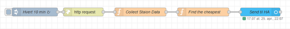 Det var ikke min hensikt å promotere NodeRED ut over hva jeg selv har erfart. Andre må mene og velge det de syns er best. Noe av hensikten med dette fora er å formidle metoder og løsninger man selv har funnet, samt å få hjelp til å løse problemer og tips til forbedringer. Slik ser nå min NodeRED Flow ut, etter at jeg har forenklet og trimmet den litt: Og slik er resultat i HA blitt. Søket gjøres blant 30 utvalgte stasjoner mellom Oslo vest og Asker.1 poeng