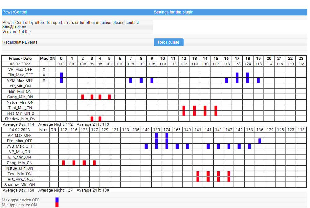 PowerControl er en plugin for HomeSeer som vil forenkle styring av strømforbruk etter strømpriser. Den lager automatisk ett konfigurerbart antall On/Off devicer i HS ved første gangs kjøring. Devicene slås Off og On ettersom prisene er høye eller lave. Det fins to typer devicer, Max og Min. En Max device går Off når prisen går over en grense, en Min device går On når prisen går under en grense. Du kan definere så mange slike devicer som du vil. En parameterfil definerer devicer og prisgrenser etc. Denne kan editeres fra web-grensesnitt. Disse devicene lager da eventer i HS som igjen kan styre fysiske devicer som varme, varmtvann osv. Du kan og definere hvor lenge en device kan være av- eller påslått, eller innenfor et gitt tidsrom. Grensesne kan settes som pris i øre, eller når pris går over eller under gjennomsnittspris. Uansett vil programmet finne de laveste prisene med de gitte kriterier, Du kan også knytte en device opp mot en eksisterende HS device ved hjelp av en Shadow device. I tillegg til ON/OFF kan denne også sende verdier til HS device, som feks termostat setpunkt. PowerControl kan lese effektforbruk ved hjelp av en AMS måler på HAN porten, og sende data til HS. Effektforbruk kan også hentes fra HS om det fins der feks, fra Tibber. Programmet kan redusere maks effektforbruk ved å slå devicer av for å holde forbruket under en bestemt grense pr time for å redusere nettleie. Forbruk og priser vises grafisk, og du kan også logge enkeltforbrukere og vise forbruket i diagram. Eksempler på bruk Du kan kombinere flere devicer i HS ved hjelp av eventer og lage en varmestyring som virker slik: - Sett dag og natt-temperatur i HS. Kombiner så dette med en PriceControl-devicer som: -Setter ned temperatur hvis strømmen blir ekstra dyr basert på en fast grense, eller høyere enn gjennomsnitt den dagen. - Setter opp temperaturen om strømprisen går under en fast grense, under strømstøtte grensen, eller under gjennomsnitt. - Slår av devicer om effektforbruk en time går over en grense. Les mer i Help dokumentet. PowerControl kan også lese effektforbruk ved hjelp av en AMS måler på HAN porten, og sende data til HS samt logges til fil. Dette er ingen skybasert løsning og den er leverandør-uavhengig. Priser hentes gratis fra ENTSO-E. Web status display Visning av priser og forbruk. Dynamisk oppdatering av Charts. Tekst nederst viser øyeblikkets strømpris, forbruk og total for timen. Oppdateres en gang i minuttet. Chart som viser pris og forbruk oppdateres en gang i timen. Kjekt å henge på veggen for å følge med. Konfigurerbare Devicer du kan knytte til events i HS. Her for å styre varmepumpe. Sette ned varme ved høy pris og sette opp varme ved ekstra lav pris. Logging av forbrukere vises grafisk Release V3.0.0.0 For å forenkle oppsett av devicer er det laget forhåndsdefinerte device typer kalt Device Functions. Ved å velge en Function reduserer du parameterantallet. Du kan selv også definere og endre Device Functions. Ønsker du å bruke Device Functions for eksisterende devicer må du legge inn en parameter på hver device som definerer dens funksjon. Se under. Ny strømstøtte-modell av 2023 er lagt inn. Du må sannsynligvis endre noen av device parametere på grunn av dette. Priser med og uten strømstøtte vises. Forbedret lesning av effektforbruk fra HomeSeer/ Tibber. NB! Se manual om oppsett. Eventer er endret slik at også Max type plottes som rødt når de er ON. Ønsker du å beholde det gamle slik at de plottes som blå når de er OFF kan du endre dette i config fanen. Parameter PlotMaxAsRed = False i INI fil under [General] Mere Tooltip help er lagt til. Bytt filen PowerControlTooltip.ini i HomeSeer\Config Release V3.0.0.1 Det snek seg inn en liten bug som gjør at priser uten strømstøtte ikke blir flyttet over til neste dag etter midnatt. Dette har ingen praktisk betydning, for beregninger. 3.0.0.1 er releaset. Det holder å bytte exe fil hvis du oppdaterer fra 3.0.0.0 Release V3.0.0.2 06.04.2024 Bugfix: Tooltip help tekst for Device setup manglet. Bugfix: Strømstøtte priser blir feil når pris er under grense- 73 øre. Nytt: La til timespan for når Max priser-devicer er lov å slå av. Dvs, innenfor dette tidsrommet blir ikke device slått av uansett. (grunnet klage fra kona om kaldt kontor om morgenen) Dynamisk oppdatering av Charts. Tekst nederst som viser øyeblikkets strømpris, forbruk og total for timen. Oppdateres en gang i minuttet. Chart som viser pris og forbruk oppdateres en gang i timen. Kjekt å henge på veggen for å følge med. Ny parameter under Config- Chart & Log «Chart Font Size». Her kan du sette font på Chart for å lette lesing. Default= 12 Release V4.0 21.04.2025 Det har vært en del endringer i ENTSO-E formatet. PowerControl er nå endret til å supportere priser for hvert kvarter som det nye formatet støtter (men foreløpig ikke bruker), samt at det kommer priser for to dager. I tillegg er måling av strømforbruk utvidet og forbedret. Lesing av forbruk fra HomeSeer (Tibber) er gjordt mere stabilt. Du kan nå lese fra HomeSeer Devicer, AMS Leser/POW_U, Homewizard P1 Meter, eller fra andre WiFi målere som leverer data på JSON format. Eller fra en fil. Nytt i denne versjonen: Oppsett for å lese effektforbruk fra mange typer målere. Bedret feilsjekking av effektdata. Endret logikk for å lese effekt fra HS (Tibber) Prislesing fra ENTSO-E forbedret. Takler nå at priser mangler. (forrige times pris brukes) Leser også prisfiler med priser for hvert kvarter. ToolTip for alle verdier i Config skjermbilder Du kan velge å vise alle dagens eller morgendagens priser på devicer i HS, og bruke disse i script. NB. For detaljer om hvordan oppgradere les nederst i dokumentasjonen. PowerControl_V4.0.zip PowerControlHelp - V4.0.0.0.pdf1 poeng