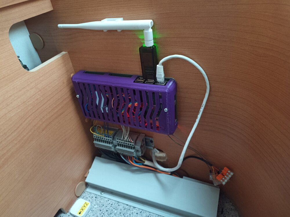 Da er jeg i boks med fjernstyring av Alde 3000 vannbåren varme og fjernstyring av stigetrinn i bobilen. Kabler var greie å komme til. I boksen er en RPi 3B+ og 2x4 rele som styres av Node-RED med Node-RED Dashboard som brukergrensesnitt. Som en bonus fikk jeg også med meg zigbee2mqtt, Mosquitto og en G-sensor som forteller meg om bilen står beint. Det hele plassert i custom designet 3D printet boks:4 poeng