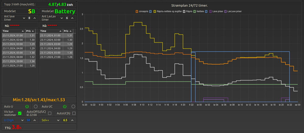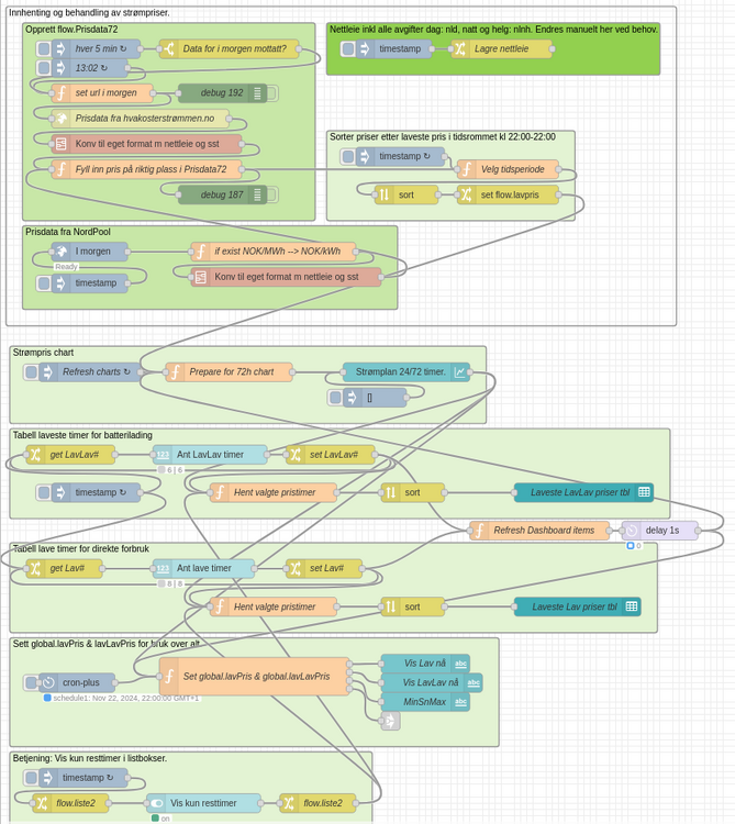 Har hatt et litt for komplisert program for å finne de laveste strømpristimene (etter litt for mange strømprisleverandører som dukker opp for så å forsvinne igjen...) så nå har jeg skrevet om og koden er blitt delelig med andre... Det kan fremdeles se litt komplisert ut men flyten er stort sett ovenfra og ned men om en gjør endringer i f.eks. timevalg må en gå litt tilbake og oppdatere uten å lage en endeløs loop. Funksjonen er rimelig enkel: Strømpriser hentes fra hvakosterstrommen.no (med manuelt alternativ fra NordPool) kl 13:02 og gjentas hvert 5. minutt inntil strømdata er mottatt. En kan velge et antall billige timer en trenger (2 alternativer) og er en innenfor de valgte timer slås der på globale variabler: lavPris og lavLavPris som kan benyttes fritt til å styre f.eks bereder. Systemet forholder seg kun til totalpris inkl avgifter og strømstøtte siden det er den vi virkelig betaler men de andre prisene vises også for informasjon. Systemet lagrer strømpriser for 72 timer og har en "Planleggingsperiode" fra kl 22:00 til 22:00. Denne perioden er valgt siden nettleien faller kl 22:00 i ukedagene og det kan være greit å få med seg. Det hele vises grafisk på en rimelig oversiktlig måte (mener jeg...). Om/Når nettleien endrer seg må det endres i noden "Lagre nettleie" og aktiviseres med trykk på "timestamp". Pr i dag ligger nettleie inne med 0.7 og 0.6 for hhv dag og natt/helg. Flowen ser slik ut: Skjermbilde med betjening (i dette bildet er med noen få tilleggselementer som er viktig i mitt system men som ikke har noe med strømpris å gjøre): Ant lave timer og Ant LavLav timer er valg for hvor mange timer en vil ha. Listboksene under viser de utvalgte timene inkl strømpris for hver time. Over listboksene vises status: Om en er innenfor eller utenfor de valgte timene. De utvalgte timene vises i grafen som lilla. "Vis kun resttimer" er et valg for å fjerne timer som er "brukt" fra listboksene. Dette er kun et visuelt valg og påvirker ikke annen funksjon. Graf Blå er planleggingsperioden og også markert inneværende time. Graf Oransje er total strømpris som vi betaler og resten i grafen sier seg selv med etikettene øverst. Visning av "Vis kun resttimer" og overgang til ny planperiode: Visning av når nye prisdata ankommer kl 13:02: [{"id":"8a9326e69a043d08","type":"delay","z":"b468e89a030cb946","name":"","pauseType":"delay","timeout":"1","timeoutUnits":"seconds","rate":"1","nbRateUnits":"1","rateUnits":"minute","randomFirst":"1","randomLast":"5","randomUnits":"seconds","drop":true,"allowrate":false,"outputs":1,"x":1040,"y":840,"wires":[["143924fdaab67cff","cb7159478bedaaf1"]]},{"id":"178c4f3e51c168f5","type":"function","z":"b468e89a030cb946","name":"Refresh Dashboard items","func":"var m1 = {reset:true};\nreturn [[m1,msg]];","outputs":1,"timeout":"","noerr":0,"initialize":"","finalize":"","libs":[],"x":850,"y":840,"wires":[["8a9326e69a043d08"]]},{"id":"19314273e31cb034","type":"group","z":"b468e89a030cb946","name":"Strømpris chart","style":{"fill":"#e3f3d3","label":true,"color":"#000000"},"nodes":["d45591226bb68efc","1366923163fe3133","cb7159478bedaaf1","08a9ac90d5a7da54"],"x":14,"y":549,"w":752,"h":122},{"id":"d45591226bb68efc","type":"ui_chart","z":"b468e89a030cb946","g":"19314273e31cb034","name":"","group":"a51799506567a0f3","order":2,"width":"0","height":"0","label":"Strømplan 24/72 timer.","chartType":"line","legend":"true","xformat":"dd HH","interpolate":"step","nodata":"wait","dot":false,"ymin":"","ymax":"","removeOlder":"48","removeOlderPoints":"100","removeOlderUnit":"3600","cutout":0,"useOneColor":true,"useUTC":false,"colors":["#ff7f0e","#62a0ea","#edd400","#f7f7f7","#98df8a","#62a0ea","#813d9c","#9467bd","#c5b0d5"],"outputs":1,"useDifferentColor":false,"className":"","x":640,"y":590,"wires":[["b6089f059556a469","45a6be97437e5578","143924fdaab67cff"]]},{"id":"1366923163fe3133","type":"inject","z":"b468e89a030cb946","g":"19314273e31cb034","name":"","props":[{"p":"payload"}],"repeat":"","crontab":"","once":false,"onceDelay":0.1,"topic":"","payload":"[]","payloadType":"json","x":590,"y":630,"wires":[["d45591226bb68efc"]]},{"id":"cb7159478bedaaf1","type":"function","z":"b468e89a030cb946","g":"19314273e31cb034","name":"Prepare for 72h chart","func":"let markPlanPer = flow.get(\"prisMax\") + 0.2 || 1.5; // Høyde på markør for planperiode og inneværende time\nlet markSelHours = markPlanPer * 0.08; // Høyde på markør for planperiode og inneværende time\nlet markCurrentHour = markPlanPer * 0.98;\n\nlet prisMax = -99;\nlet prisMin = 99;\nlet prisSnitt = 0;\nlet dt = new Date();\n//Ny periode kl 22:00: Flytt dato til over midnatt for å sette periodestart og slutt.\nif (dt.getHours() >= 22) dt = new Date(Number(dt) + 4*60*60*1000);\n\nlet dt2 = Number(new Date(dt.getFullYear() + \".\" + (dt.getMonth()+1) + \".\" + dt.getDate() + \" 00:00\"));\nlet dtPerStart = dt2 - 2*60*60*1000;\nlet dtPerEnd = dt2 + 22*60*60*1000;\n\n//node.warn(dtPerStart);\n//node.warn(dtPerEnd);\n\n// Resett dt til riktig tid.\ndt = new Date();\n\n\ndt.setDate(dt.getDate());\nlet currHour = dt.getHours();\nlet currDate = dt.getDate();\nlet currMonth = dt.getMonth() + 1; // Mnd er 0-11 i utgangspunktet\nlet currYear = dt.getFullYear();\nlet currPlanPerStart = new Date()\n\nlet timerValgtLav = []\ntimerValgtLav = flow.get(\"timerValgtLav\");\nlet timerValgtLavLav = []\ntimerValgtLavLav = flow.get(\"timerValgtLavLav\");\n\nlet pdt=0; //PrisDenneTime for kalkulasjoner\nlet msg2 = [[],[],[],[]];\nmsg2.payload = [{ \"series\": [\"Jonaspris\", \"\", \"Råpris+nettleie og avgifter\",\"Råpris\",\"Nettleie\",\"\",\"Lave priser\",\"LavLave priser\"], \"data\": [[],[],[],[],[],[],[],[]], \"labels\": []}];\nlet pris72 = flow.get(\"Prisdata72\");\nlet i = 0;\n\nif (pris72 != null) {\n for (i = 0; i < pris72.length; i++){\n pdt = Number(pris72[i].pris);\n var priceHourTimestamp = new Date(pris72[i].ts);//new Date(pris48[i].timestamp);\n msg2.payload[0].data[0][i] = {\"x\": Number(pr