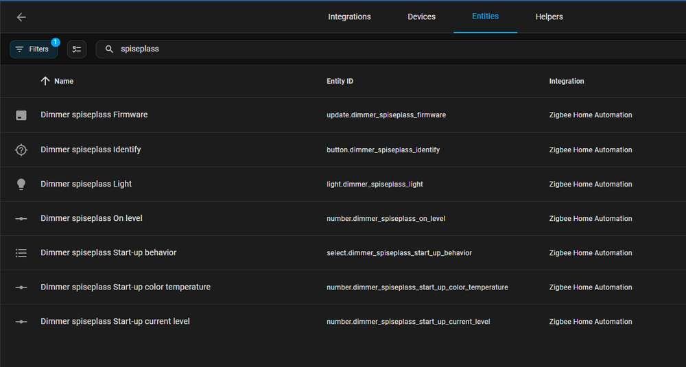 5. Hei, Jeg har kjøpt overnevnt dimmer på Elektroimportøren og ønsker å sette opp en automasjon som endrer fargetemperatur på downlightene som dimmer kontrollerer. Det er mulig å endre fargetemperaturen i HA med ZHA-integrasjonen når jeg klikker inn på device'n, men jeg ser ikke helt hvilken entity som faktisk styres når jeg endrer fargetemp ved å dra slideren under mellom 0% og 100%. Og følgelig skjønner jeg ikke helt hvordan jeg skal sette opp automasjonen som jeg ønsker. Er det noen som har en tanke? Her er entities knyttet til dimmer spiseplass: