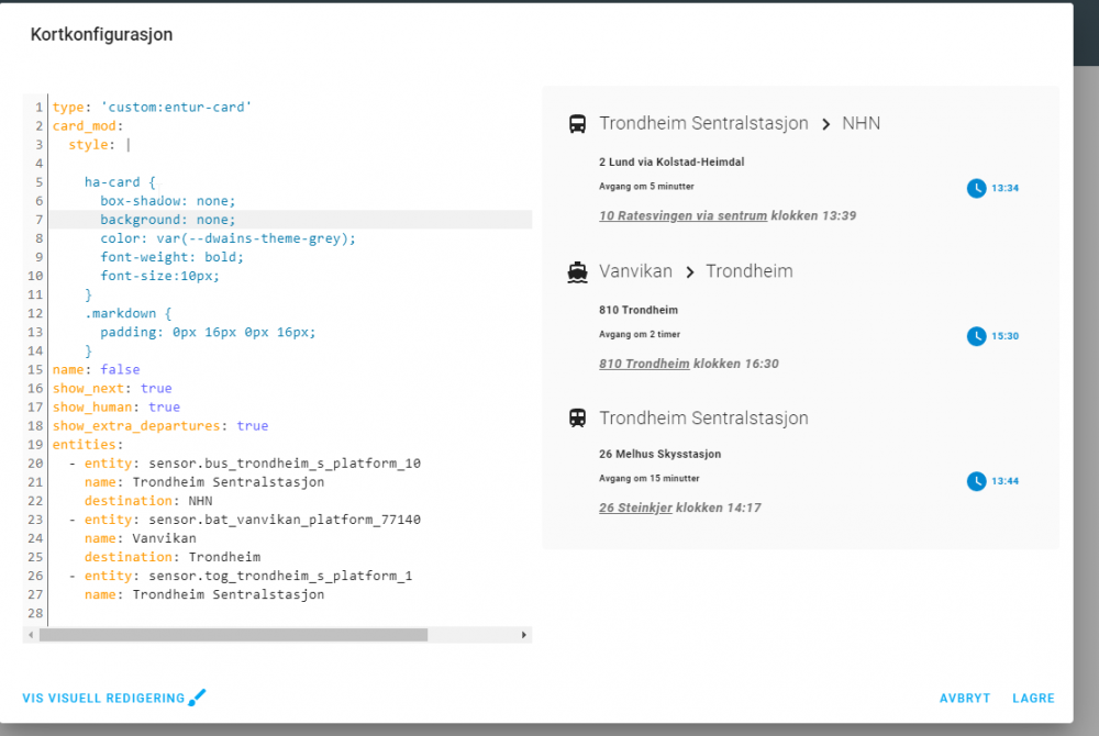 Her er card-mod endringene - type: "custom:entur-card" card_mod: style: | div.entur-line { color: var(--primary-text-color); font-size: 14px; } h2.entur-station { color: var(--primary-text-color); font-size: 15px; font-weight: 300; margin: 0.3em 0px; } name: false show_next: true show_human: true show_extra_departures: true entities: - entity: sensor.bus_trondheim_s_platform_10 name: Trondheim S. destination: NHN - entity: sensor.bat_vanvikan_platform_77140 name: Vanvikan destination: Trondheim