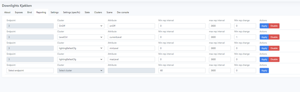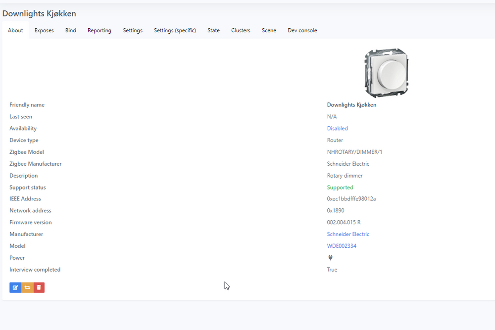 Overgangen fra deconz til zigbee2mqtt har vært en drøm bortsett fra at 3 av mine elko dimmere ikke fungerer. Jeg får parret de, og når jeg vrir på dimmeren manuelt kan jeg se lightlevel oppdatere seg i zigbee2mqtt. Men når jeg prøver å slå av/på lyset, så skjer det ingenting. Noen som ha disse parret med zigbee2mqtt? Er disse dimmerne jeg snakker om https://proff.elko.no/smartdim-vri-uni-200w/category2951.html