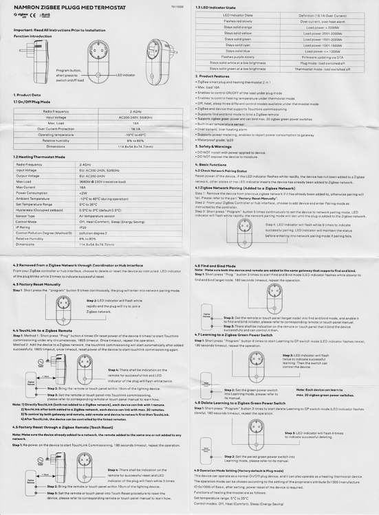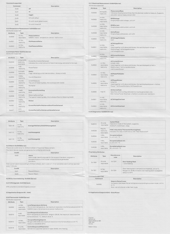 @slippern Etter rmykje prøving og feiling er eg komme eit museskritt vidare og får til å slå av og på thermostatmodus via Z2M, med denne definisjonen, men hanger for øyeblikket på å få til termostatdelen. Den har eit termostatkluster, men det ligg på endpoint 2 og ikkje 1. Du kan prøve koden nedanfor og tilpasse den til varianten uten -N og sjå om du får slått på thermostatmodus, då vil den lyse grønn når den er i termostatmodus og temperaturen er under setpunktet. const fz = require('zigbee-herdsman-converters/converters/fromZigbee'); const tz = require('zigbee-herdsman-converters/converters/toZigbee'); const exposes = require('zigbee-herdsman-converters/lib/exposes'); const reporting = require('zigbee-herdsman-converters/lib/reporting'); const extend = require('zigbee-herdsman-converters/lib/extend'); const e = exposes.presets; const ea = exposes.access; const DataType = { uint16: 0x21, enum8: 0x30, } const manufacturerOptions = { namron : {manufacturerCode: 0x1224} }; const op_modeValues = ['onnoff', 'HVAC']; const tz_opmodeCfg = { key : ['OperationMode'], convertSet: async (entity, key, value, meta) => { const numOpMode = Number(value=='HVAC'); const payload = {0x1000: {value: numOpMode, type: DataType.enum8}}; await entity.write('genBasic', payload, manufacturerOptions.namron); return {readAfterWriteTime: 250, state: {OperationMode: value}}; }, convertGet: async (entity, key, meta) => { await entity.read('genBasic', 0x1000, manufacturerOptions.namron); } } const fz_opmodeCfg = { cluster: 'genBasic', type: ['attributeReport', 'readResponse'], convert: (model, msg, publish, options, meta) => { const result = {}; const data = msg.data; if (data.hasOwnProperty(0x1000)) { result['OperationMode'] = op_modeValues[msg.data['0x1000']]; } return result; }, } const definition = { zigbeeModel: ['4512749-N'], model: '4512749-N', vendor: 'Namron', description: 'Thermostatplugg-test', fromZigbee: [fz.metering, fz.electrical_measurement, fz.on_off, fz.temperature, fz_opmodeCfg], toZigbee: [tz.on_off, tz.power_on_behavior, tz_opmodeCfg], exposes: [ e.temperature(), e.power(), e.current(), e.voltage(), e.switch(), e.power_on_behavior(), e.enum('OperationMode', ea.SET, op_modeValues).withDescription('Set operation mode as ON/OFF or as Thermostate'), ], configure: async (device, coordinatorEndpoint, logger) => { const endpoint = device.getEndpoint(1); await reporting.bind(endpoint, coordinatorEndpoint, ['genBasic', 'genOnOff', 'haElectricalMeasurement', 'msTemperatureMeasurement']); await endpoint.read('haElectricalMeasurement', ['acVoltageMultiplier', 'acVoltageDivisor']); await endpoint.read('haElectricalMeasurement', ['acPowerMultiplier', 'acPowerDivisor']); await endpoint.read('haElectricalMeasurement', ['acCurrentMultiplier', 'acCurrentDivisor']); await reporting.onOff(endpoint); await reporting.temperature(endpoint, {min: 10, change: 10}); await reporting.rmsVoltage(endpoint, {min: 10, change: 20}); // Voltage - Min change of 2v await reporting.rmsCurrent(endpoint, {min: 10, change: 10}); // A - z2m displays only the first decimals, so change of 10 await reporting.activePower(endpoint, {min: 10, change: 1}); // W - Min change of 0,1W }, }; module.exports = definition;