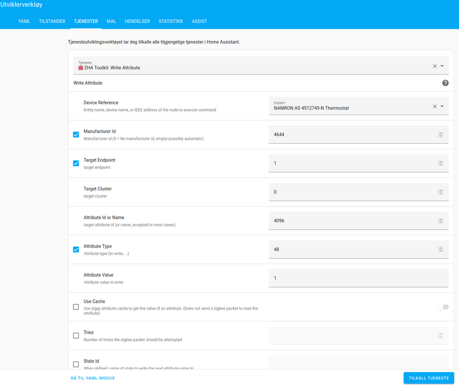 Litt gammal tråd ser eg, men kan bekrefte at Namron sin Zigbee plugg med termostat fungerer som termostatplugg, berre den er konfigurert rett. Ut av boksen fungerer den som av/på plugg, men ved å skrive til ein produsentproprietær attributt så vil termostatmodus bli aktivert. Dette står i leafletten som følger med, og etter litt prøving og feiling med ZHA Toolkit så fekk eg det til å fungere. Når den atributten er satt så ser den ut til å bli hugsa av pluggen, sjølv om den blir fråkopla. Det vedlagte biletet viser kva eg gjorde i ZHA Toolkit for å få det til å fungere. Som sagt nok å utføre denne kommandoen ein gang pr plugg. Kanskje Zigbe2MQTT har denne funksjonen innebygd? Eg har ikkje prøvd Zigbee2MQT, så eg veit ikkje.