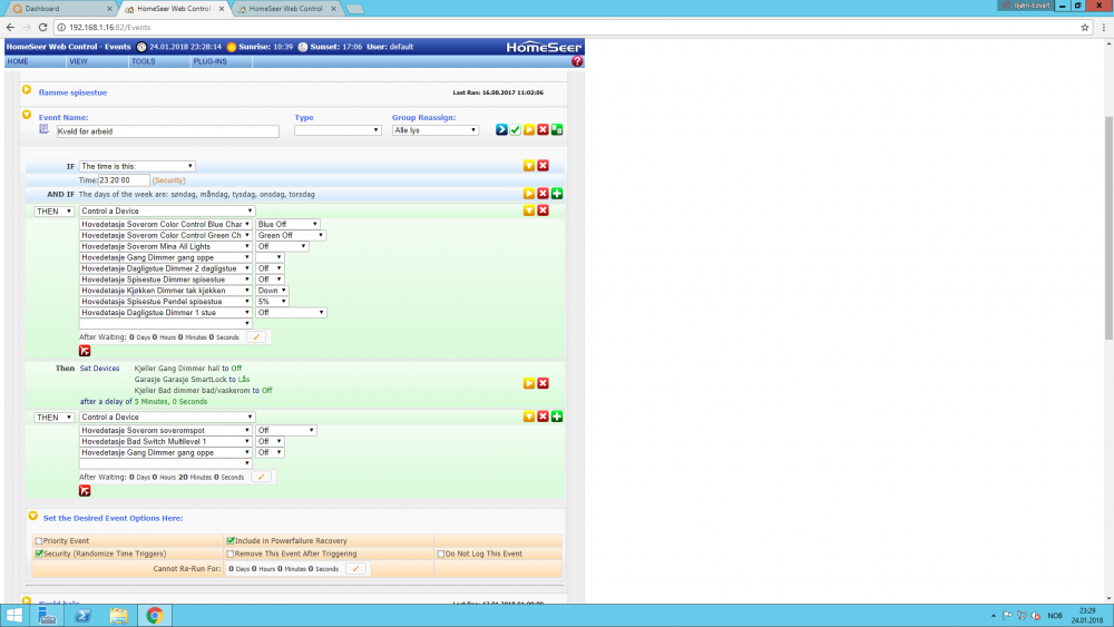 Jeg har egentlig ikke sett det veldig store behovet, mer en "nice to have", men har forsøkt å aktivere "security" på noen eventer. Security offset er satt til 30 minutter i innstillingene, og jeg tenkte nå for meg selv at det i kombinasjon med at parameteren er aktivert på eventen er tilstrekkelig, men dette virker ikke... Er det noen her som ser noe helt opplagt jeg har missforstått eller glemt av? (Det er forøvrig en stor grønn "V" på "Options" før en åpner den. Eventet fungerer ellers godt (sett bort ifra at jeg definitivt burde endre enten døgnrytme eller klokkeslett den der skal starte på da )