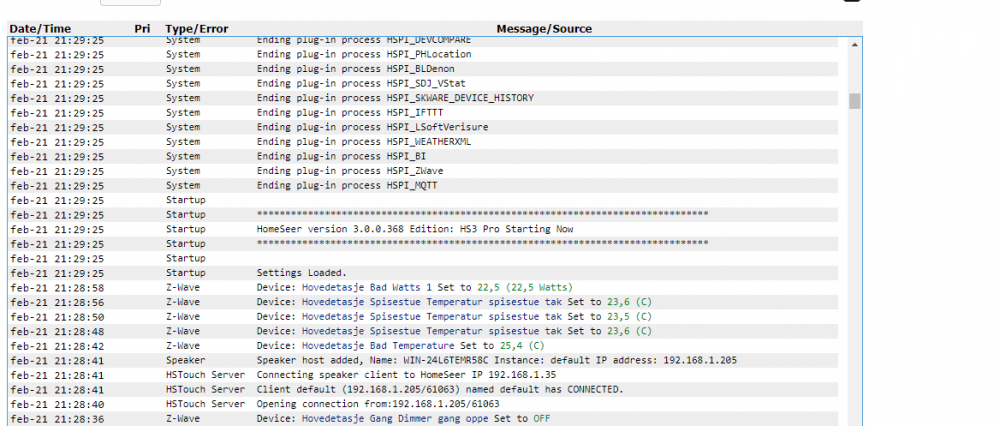 Beklager slapp oppfølging her! Jeg har sett litt på dette innimellom, og det har stort sett ikke vært verre enn at jeg har kunne leve med det. I dag skjedde det derimot noe jeg ikke kan leve med! ZXT-120 som styrer varmepumpa hadde plutselig blitt satt til "Cool" og 20c. Når det plutselig skjedde på vinterens så langt kaldeste dag var ihvertfall timingen særs dårlig, og jeg fant ut at dette må jeg bare finne ut av.. Noen uforklarlige hendelser har jeg hatt lenge, f.eks vil ikke lyset i kinoen stå på særlig lenge av gangen.. Dette har jeg forsøkt å sjekke opp via events, og det er som antatt ingen andre events enn de jeg har laget som skal kontrollere dimmeren som gjør noe med dimmeren, og de eventene har fungert tidligere. En annen ting jeg har stusset på lenge, er at det er kommet veldig mange devicer som har "Floor" satt til "Node xx", i tillegg til at navnene er blitt endret, det kan gjerne være "Z-wave goap switch" eller lignende. Jeg kan definitivt bli bedre med navngivning, men jeg har om ikke annet ihvertfall alltid en beskrivelse på root device'n som gjør at det ikke er noe som helst problem å skjønne hvor det er, og alle child devicene ligger naturligvis på samme etasje og rom - det gjør de plutselig ikke lenger. Nå i kveld har jeg sett litt på Z-seer, og bet meg merke i en ting: (Beklager dårlig screenshot - har ikke Snagit el. på serveren..) Legg merke til loggen; det er ganske mange som hoppes over da den sier "Since it's node is 0". Noe sier meg at det er noen referanser til Z-stick'en som henger igjen, men det ser tilsynelatende ok ut i HS3.. Forsøkte også å se i z-wave.db, men jeg klarer ikke å skjønne helt hva det er som ligger der, det er nokså intetsigende når jeg ser med SQLite Administrator ihvertfall.. Er det noen her som kan bekrefte/avkrefte mine antagelser, og evt har noen idè om hva jeg kan gjøre for å komme til bunns i dette en gang for alle? Nå forsøker jeg å nøste i alle de med floor "Node xx" ved å se hva adressen til noden er, for så å søke opp i samtlige devicer, men det er en nokså nøysommelig prosess, og i mange tilfeller lykkes jeg ikke med å finne ut hva det er for noe.. (De opprinnelige navnene mangler på disse devicene i 90% av tilfellene - unntaket er der det kanskje henger igjen på en child device.)