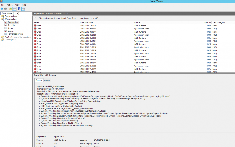Når jeg kom fra kontoret i dag irriterte jeg meg veldig over at garasjeporten ikke var helt stødig, men tenkte ikke så veldig mye mer over det, ikke tenkte jeg mer over at lysene ikke slo seg på når det begynte å bli mørkt heller, men når porten kranglet enda mer senere på kvelden måtte jeg inn å sjekke.. Først i HS3, der fant jeg dette: Ser jo ingen ting som indikerer at systemet går ned, men det viste seg å ha skjedd MANGE ganger.. Begynte så å gå etter på serveren, og fant dette; Det er forøvrig Jowihue som går igjen både i .NET Runtime og Application Error. En ting som er merkelig her er at i utgangspunktet har det ikke skjedd noe som helst nevneverdig på serveren på en god stund - sjekket faktisk tidligere i dag, og da var oppetida på 28 dager.. JowiHue tror jeg heller ikke er oppdatert de siste dagene (men har siste versjon - alt er up to date). Har gjort èn ting i dag: satt opp VPN på serveren (ja, jeg kjører alt på samme server enda, men en vakker dag om ikke så alt for lenge skal det virtualiseres!), men det gikk jo forsåvidt veldig fint, og det var kun oppsett - rollene var allerede installert, så det var vel knappest noen servicer som ble startet. Kjørte en omstart da det var en oppdatering som ventet i Windows Update, og etter det har det igjen vært dønn stabilt, men jeg vil jo ikke at noe slikt skal skje igjen.. Er det noen som har noen anelse om hva dette kan skyldes for noe, og hva jeg evt kan gjøre for å forhindre dette? (Kunne forsåvidt klart meg uten JowiHue, men det er igrunnen feil svar å avinstallere/deaktivere den.) Det som var litt interessant er at når jeg googla "jowihue crash", fant jeg denne fra i går: https://forums.homeseer.com/showthread.php?p=1352202 Jowihue er ikke nevnt i tråden, men det var jo litt merkelig at han tilsynelatende opplever det samme som meg, èn dag i forveien..