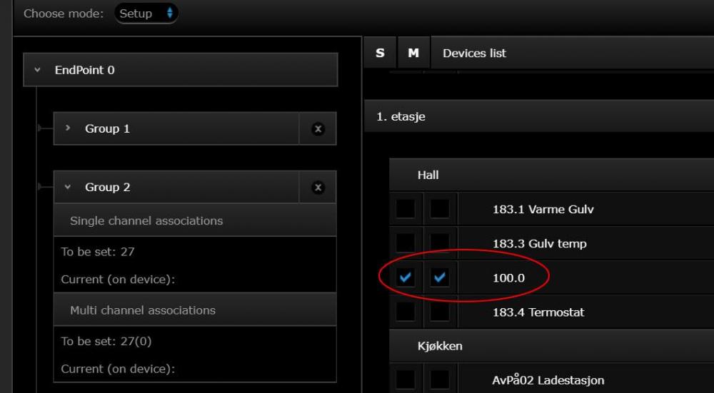 Heisann, kan noen klare å få en enkel sjel som meg til å forstå hvordan jeg får satt opp assosiasjoner med Fibaro HC2? Jeg har masse Z-wave-brytere rundt omkring i huset, men alle er satt opp med scener i HC2. Men det hadde jo vært fint om disse faktisk hadde fungert, selv om HC2 var nede for telling... Jeg har en slik Namron-bryter: https://www.elektroimportoren.no/namron-z-wave-1-kanal-bryter-k2/4512712/Product.html?Event=searchlist https://www.elektroimportoren.no/docs/namron/4512712 INSTRUCTION MANUAL.pdf Som jeg vil styre en Fibaro FGD212 dimmer med. Så vidt jeg har skjønt så skal jeg gå inn på dimmerens Settings->Advanced->Associations->EndPoint0->Group2 Deretter velge enheten som skal kontrollere dimmeren. I mitt tilfelle 100.0 som er bryteren: Jeg stusset først litt over at det står "To be set: 27" til venstre der, men det har kanskje noe med å gjøre at 100.0 er bare "navnet" til bryteren. ID er 101, mens Node ID er 27? Fibaro selv skriver derimot at: "To be set" allows for assigning devices to each association group (device ID will be shown)". Forvirringen er komplett... ? Men hva skal man velge av Single channel associations og Multi channel associations i dette tilfellet? Begge? Jeg har prøvd begge og bare S og bare M. Spoiler: ingen ting har virket. Kan det være fordi jeg allerede har scener på denne bryteren?