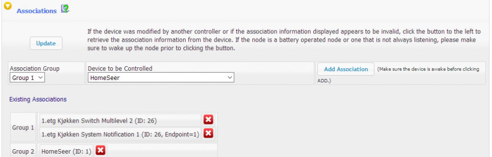 Jeg sliter litt med å få " Association " til å virke Når jeg setter opp Association så virker det veldig vilkårlig hva slags element den setter inn, her er en Mertel (Schnider) bryter jeg prøver å få til å virke. Der skal vistnok gruppe 1 være dimmeren og gruppe 2 være homeseer, har når jeg klikker på device så får jeg opp enheten jeg vil styre, men kun 1 valg. har lagt den til 2 ganger for å se hva som skjer og den legger til et nytt element hver gang, hvordan kan jeg kontrollere dette? er vel Switch Mulitlevel 1 jeg er ute etter å kontrollere.