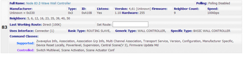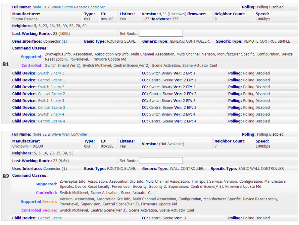 Dette er 2 like brytere, lagt inn secured. Men de gir meg litt forskjellige valg. Nedenfor er loggen til Node 82 Add Node started... Activate the 'Add to Network' function on the device... Activate the 'Add to Network' function on the device... A new node is being added... Adding a new SLAVE NODE... DONE - Add Node Operation is Complete. Done. Node 82 Added. Reloading (importing) node information... Synchronizing node information with HomeSeer and creating new device(s) as necessary... Synchronize nodes finished. Number of device nodes to be created/added = 1 Adding using S0 Security, Negotiating or Verifying SECURITY SCHEME for node 82 Z-Wave Security Scheme and Key Exchange was successful for node 82, now waiting for the device to finish storing information before proceeding... Getting SECURITY class information for node 82 Z-Wave manufacturer information for node 82, ID: 816=330H (UNKNOWN), Type: 3=3H, ID: 41227=A10BH Node: 82 Supports Class(es): ZWAVEPLUS_INFO, ASSOCIATION_V2, ASSOCIATION_GRP_INFO_V2, MULTI_CHANNEL_ASSOCIATION_V3, TRANSPORT_SERVICE, VERSION_V2, CONFIGURATION_V4, MANUFACTURER_SPECIFIC_V2, DEVICE_RESET_LOCALLY, POWERLEVEL, SECURITY, SECURITY_2, SUPERVISION, CENTRAL_SCENE_V2, FIRMWARE_UPDATE_MD_V2 Node: 82 Supports Secure Class(es): VERSION_V2, ASSOCIATION_V2, ASSOCIATION_GRP_INFO_V2, MULTI_CHANNEL_ASSOCIATION_V3, CONFIGURATION_V4, MANUFACTURER_SPECIFIC_V2, DEVICE_RESET_LOCALLY, POWERLEVEL, SUPERVISION, CENTRAL_SCENE_V2, FIRMWARE_UPDATE_MD_V2 Node: 82 Controls Class(es): SWITCH_MULTILEVEL_V3, SCENE_ACTIVATION, SCENE_ACTUATOR_CONF Node: 82 Controls Secure Class(es): SWITCH_MULTILEVEL_V3, CENTRAL_SCENE_V2, SCENE_ACTIVATION, SCENE_ACTUATOR_CONF Node 82 is a Z-Wave Plus node. Retrieving ZWPlus Info... All associations for node 82 have been retrieved successfully, it supports associations on these groups: 1, 2, 3, 4, 5. Root Node Device Node 82 Z-Wave Wall Controller was created for node 82 on network C2218D31 Connector: Adding association for Z-Wave device Node 82 Z-Wave Wall Controller (Node 82, Group 1) to HomeSeer 1 out of 1 Child devices of node 82 were created successfully. Finished. Saving network information to file: ZNet_MyNetwork_C2218D31_2018-05-09_16.23.05.ZWave. Please wait... Done!