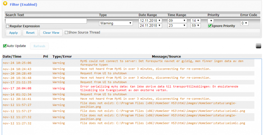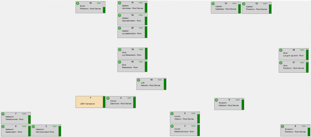 Endelig fått lagt til 20 noder (133 devices) med en avstand på maks 3 mm fra UZB1, samt endret samtlige. Navn / Device gruppe / Rom "Do not update device last change...", avhuking fjernet Device Image / Thumbnail Image Settings: Parameter 21, verdi 3, størrelse 1 byte (Status settes til off i HS om forbruket dukker under 3 watt) Parameter 10, verdi 100, størrelse 1 byte (Deaktiverer energi rapportering med høy prioritet)Parameter 11, verdi 100, størrelse 1 byte (Deaktiverer energi rapportering med normal prioritet)Parameter 14, verdi 0, størrelse 2 bytes (Deaktiverer sending av periodiske rapporter) Assosiasjoner til gruppe1 - homeseer (+gruppe 2 på varmtvannstank) Installert Z-Seer og kjørt full optimalisering. Har også satt opp regelmessig backup av HomeSeer katalogen. Ser i loggen at det er noen warnings: Er det noe mer jeg bør gjøre, før jeg begynner å legge til batteridrevne enheter?