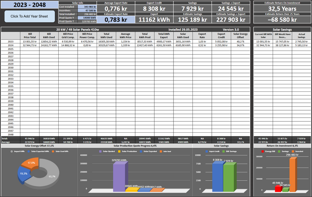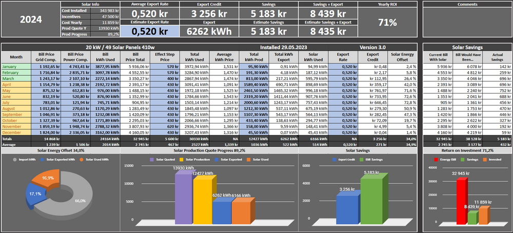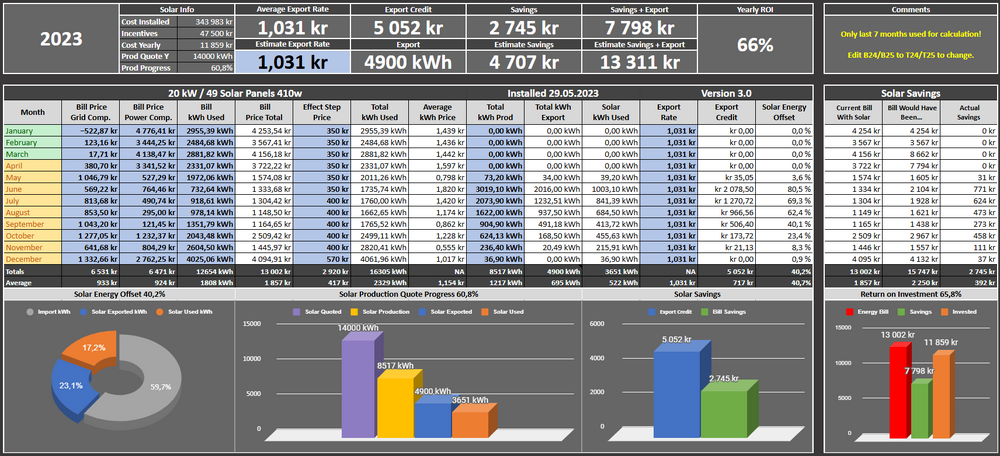 Har gått over utregningene for hva strømregningen hadde blitt uten solceller, var flere tusen feil... 32 års nedbetalingstid forsetter det som det har gjort til nå... Veit ikkje hva solceller koster nå men du skal jaggu få dei billig om det skal lønne seg... Nytt regneark uten solkonto da Haugland også har sluttet med solkonto. Eg har tatt ut overskuddet for kvar månde * prisen eg fekk for strømmen, som må sies å være skuffende for 2024... https://docs.google.com/spreadsheets/d/1uUWGfLCufmA3MMBGgf8BJyIXaLIj2iBUVi1tVM8W48U/edit?usp=sharing- 20 svar