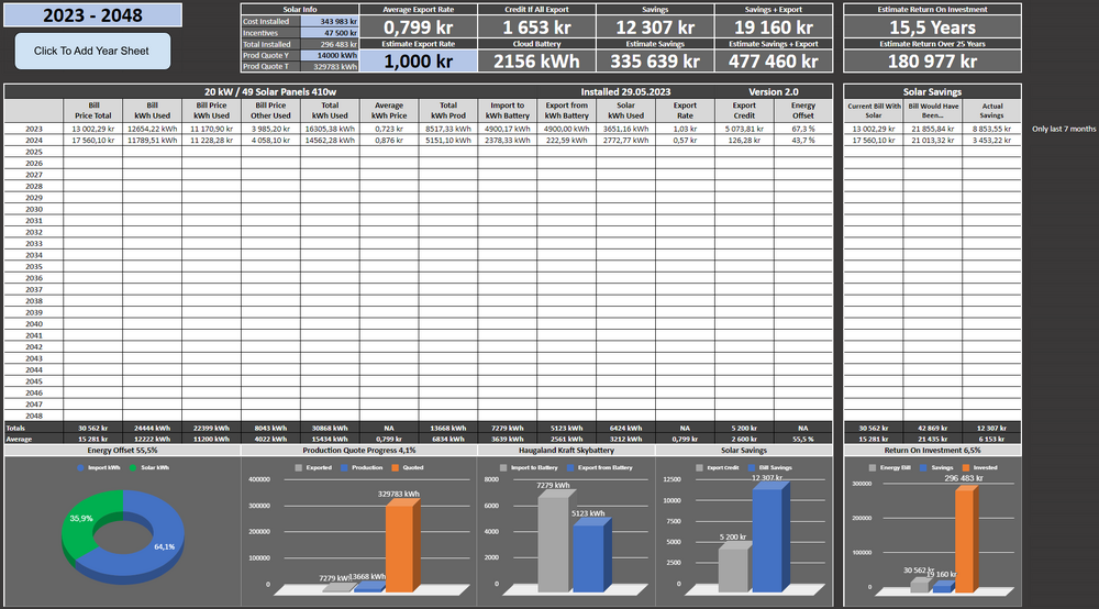 Har gått over utregningene for hva strømregningen hadde blitt uten solceller, var flere tusen feil... 32 års nedbetalingstid forsetter det som det har gjort til nå... Veit ikkje hva solceller koster nå men du skal jaggu få dei billig om det skal lønne seg... Nytt regneark uten solkonto da Haugland også har sluttet med solkonto. Eg har tatt ut overskuddet for kvar månde * prisen eg fekk for strømmen, som må sies å være skuffende for 2024... https://docs.google.com/spreadsheets/d/1uUWGfLCufmA3MMBGgf8BJyIXaLIj2iBUVi1tVM8W48U/edit?usp=sharing- 20 svar
