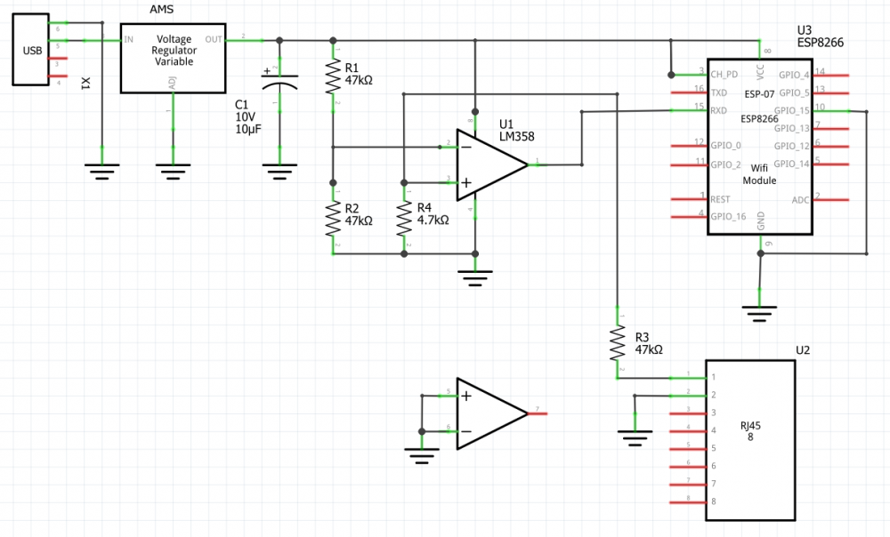 Her er @xibriz sitt skjema fra Fritzing-fila hans (ryddet bare litt i skjemaet for å gjøre det mer leselig ?). OpAmpen er en vanlig LM358, men en hvilken som helst allround opamp kan nok brukes. Spenningsregulatoren er angitt på skjemaet som variabel, men det som er brukt er vel en ikke-variabel 3,3V / 1A regulator (AMS/LM1117 el.l.) -