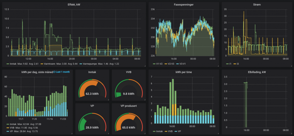 4. Har laget et dashboard for Grafana ja. Se bilde. Kan legge det på Github f.eks. i morgen kveld hvis du vil ha det som utgangspunkt. Skal også legge til videresending til HA. Gjenstår å lese ut meldinga med akkumulert forbruk (kWh) som kommer en gang i timen, så foreløpig populeres ikke dashbordet fullt ut. Hadde ikke tid til å inkludere den meldinga i går. Må innrømme at jeg faktisk likte det forrige testformatet bedre, hvor man hadde høyere oppløsning på strøm, forbruk/kWh hvert minutt og nettfrekvens også. For meg var 1 minutt oppdateringsrate plenty...