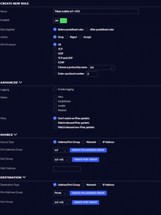 Som nevnt i denne tråden er eg i ferd med å sette opp nettverk i heimen basert på Unifi-serien til Ubiquiti, og eg prøver meg no på å opprette separat IoT-nettverk (med WiFi). Har fulgt denne guiden og har forsåvidt laga eit Corporate-nettverk som er adskilt frå primærnettverket, men dette må jo ha visse unntak for å fungere som tiltenkt. Eg har ein del Arduino-kort på nettverket som skal sende (og potensielt motta) data til HS. HS brukar port 80, og om eg forstår det rett må eg vel då opne port 80 frå IoT-nettverket inn i primærnettverket der (bl.a.) HS-serveren står. Eg trur eg må opprette ein ny regel under "LAN IN" i Unifi-settings, men deretter er eg nokså blank. Har oppretta ei "gruppe: Og har prøvd på å opprette ein regel under "LAN IN", men er svært usikker på om alt er rett (er vel i grunn nesten sikker på at mykje er feil): Er det nokon som har tips for å få meg på rett spor?