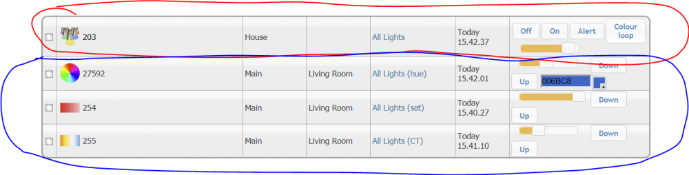 Usikker på hvor feilen ligger, men slik jeg forstår er devicen i den røde sirkelen root-komponenten, og de i de blå er children. Ved Alexa-appen blir bare settings fra root hentet ut, og ting som farger (det som ligger i "hue") føler ikke med.