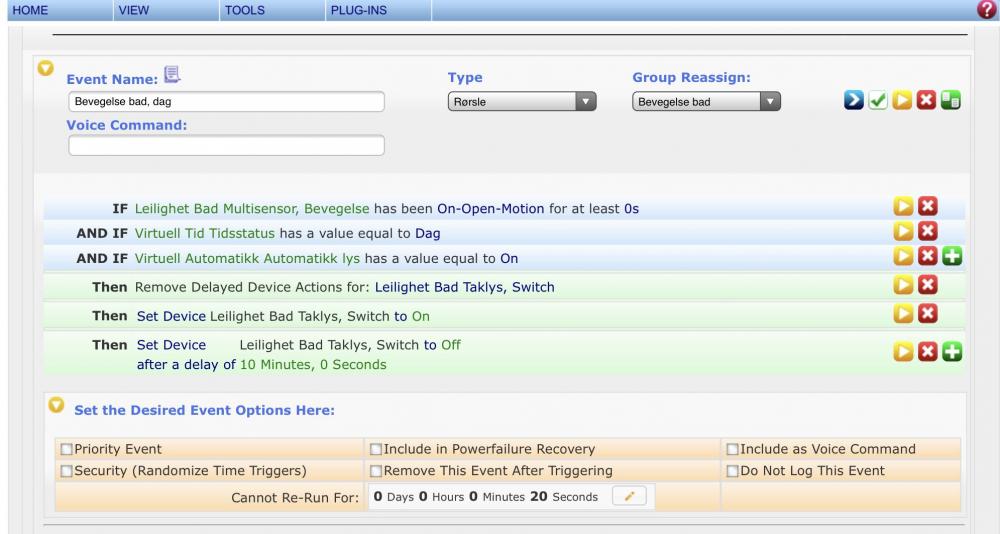a) Feilen er at eventen Moskus har laga er for ein bevegelsessensor med ein litt annen virkemåte. Sensoren «setter» tydelegvis devicen kvar gang ny bevegelse blir mottatt, medan den du har (og eg har) har ein device som held seg aktiv så lenge den oppdagar bevegelse innanfor «timeout»-tida (hugsar ikkje standard «timeout»-tid, men du finn den i brukarmanualen). Du må derfor løyse det på ein annan måte enn å bruke «device has its value set to», sidan det kun skjer når den oppdagar bevegelse «første gang». Eg ser at du i tillegg har benytta devicen for «Home security» (alarm), og ikkje den som er beregna for lysstyring. Om det har praktisk betydning eller ikkje veit eg ikkje. Eg har i alle fall løyst det slik som i biletet under. Merk at eg i tillegg har 2stk «and if», desse skal ikkje vere nødvendige for å få det til å fungere, men eg brukar dei i alle fall slik: 1. For å kunne deaktivere all automatikk for lys via kun éin virtuell device (og ikkje måtte deaktivere 1000 eventar). 2. At lysnivået på badet skal vere avhengig av morgon/dag/kveld/natt. Eg har også satt opp at eventen ikkje skal gå oftare enn kvart 20. sekund, dette for å unngå at den går heile tida. b) Timeout-tid er som sagt omtalt i brukarmanual.