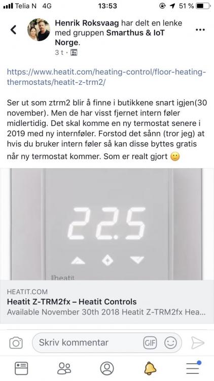 Kom over denne Facebook-posten på gruppa Smarthus & IoT Norge (sjå screenshot under). https://www.facebook.com/groups/smarthusnorge/ Lenke i post: https://www.heatit.com/heating-control/floor-heating-thermostats/heatit-z-trm2/ For oss som ventar på termostatar og har tenkt å bruka golvfølarar er jo dette gode nyheiter. På nettsida står det i alle fall at den blir tilgjengeleg frå 5. desember.