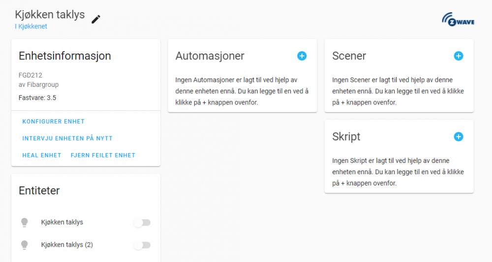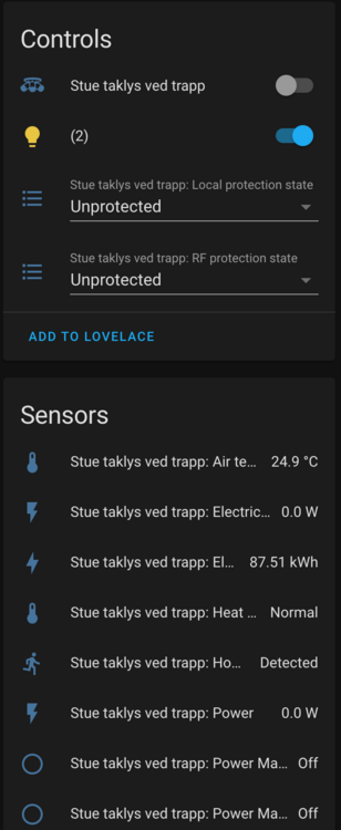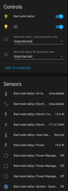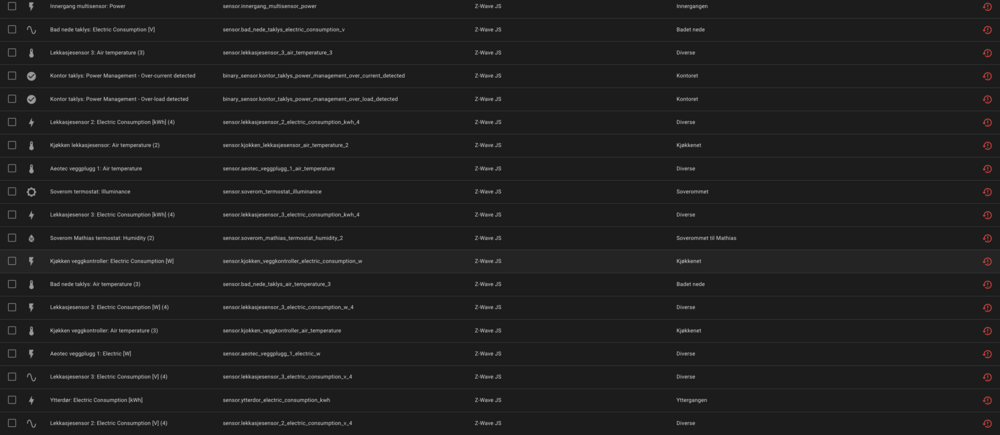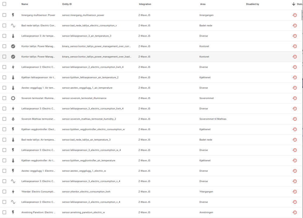 Nei, det er svært sjelden det er tapte pakker eller feilmeldinger relatert til Z-wave. Har mange z-wave-enheter jevnt fordelt i huset og meshet er raskt og veldig responsivt ellers, aldri noen problem og i bruk oppleves det som veldig stabilt. Men så dukker det stadig opp rare feil. Etter noen runder med healing og re-intervju har jeg en god liste med bogus entiteter, som sikkert må slettes manuelt (igjen). Disse burde jo aldri kommet inn, men forsvinner altså med et re-intervju, og må vel så fjernes manuelt. Her er det bl.a. strømforbruk på Fibaro lekkasjesensorer, Aeotec multisensorer og Sensative Strips. Det er lufttemperatur på en Aeotec Smart Switch, en Fibaro Dimmer 2 og en Sunricher-kontroller. Det er Illuminance på en Heatit termostat osv. Altså ikke relatert til spesifikke typer enheter heller.