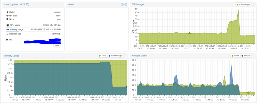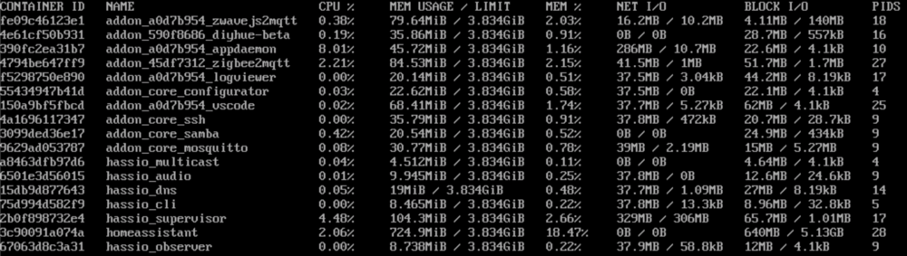 Usikker. Men HA gikk tom for minne og kræsjet ca. kl. 14:04. Jeg kjørte deretter en restart og så feilet z-sticken ca. kl. 14:29. Så klarer ikke se noen direkte sammenheng ihvertfall. Men har som nevnt før opplevd at z-wave ikke kommer opp etter en restart, og så etter en restart av add-on kan det fungere stabilt lenge. Har så langt søkt på mariadb. Fant bare en masse diskusjoner og trøbbel rundt flytting av data, så utsatte det litt. Skal sjekke ift MySQL og se om jeg finner noen oppskrift. Nei, veldig lite. Det er 6 stk 4TB disker i RAIDZ2 med ZFS. Er en gammel server, med forholdsvis liten belastning generelt 😛 Noe "topper" på IO delay ifbm backup hver natt, ellers ingenting. Så er ganske sikker på at feilen ikke ligger ift disker/filsystem. homeassistant-containeren øker stadig i minnebruk. Ved oppstart tidligere i dag ca. 400 MB, for 2 timer siden 720 MB, og nå 854 MB. Skal følge med videre om det er denne som "spiser opp" minnet. Og gå gjennom denne i morgen og se om det er noe relatert.