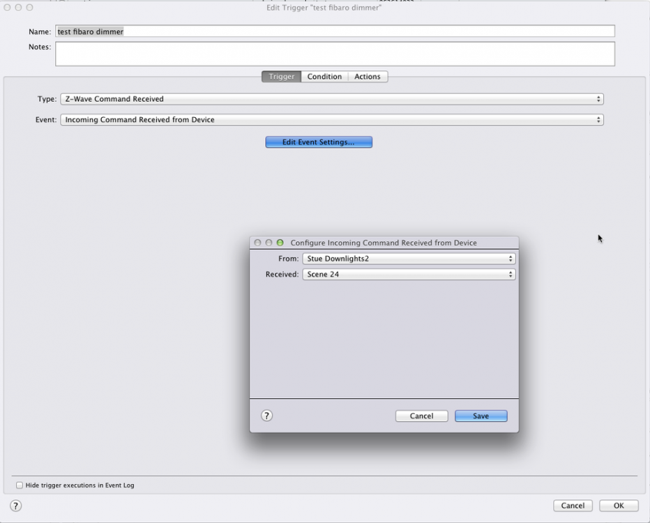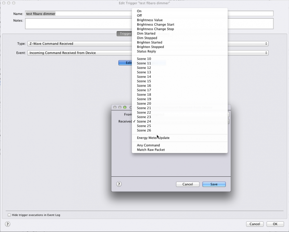 Testet litt på de to jeg har installert nå, i Indigo (edit: så nå at dette ligger i Homeseer-forumet, ikke Z-wave. Beklager den. Men kan kanskje være nyttig info likevel). Hhv enkel, dobbelt og trippelklikk på S2 gir følgende i loggen: 24. nov. 2016 23:51:57 Z-Wave received "Stue Downlights2" scene 26 Z-Wave received "Stue Downlights2" scene 24 24. nov. 2016 23:52:17 Z-Wave received "Stue Downlights2" scene 25 Kan sette opp triggers som i vedlagte bilde, basert på scene ID. Dobbeltklikk S2 gir da dette i loggen: 24. nov. 2016 23:58:39 Z-Wave received "Stue Downlights2" scene 24 Trigger test fibaro dimmer zwave test dobbeltklikk på fibaro dimmer La så til "Gang soverom2" (som er den andre Fibaro dimmeren jeg tester) assosiert i gruppe 5. Bruk av S2 gir da både scene ID og "Gang soverom2" oppdaterer seg: Z-Wave retrieved group 5 associations: [] Z-Wave added association of "Gang Soverom2" to "Stue Downlights2" group 5 Z-Wave retrieved group 5 associations: [15] Z-Wave received "Stue Downlights2" scene 26 Z-Wave received "Gang Soverom2" status update is off Z-Wave received "Stue Downlights2" scene 26 Z-Wave received "Gang Soverom2" status update brightness 80 Z-Wave received "Stue Downlights2" scene 24 Trigger test fibaro dimmer zwave test dobbeltklikk på fibaro dimmer Z-Wave received "Gang Soverom2" status update brightness 100 Z-Wave received "Stue Downlights2" scene 22 Z-Wave received "Stue Downlights2" scene 23 Z-Wave received "Stue Downlights2" scene 22 Z-Wave received "Stue Downlights2" scene 23 Z-Wave received "Gang Soverom2" status update brightness 28 Z-Wave received "Gang Bevegelse" status update is on