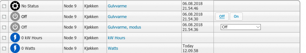 18. Da skal jeg sjekke det. Var bare i stus siden noen av heatit nodene hadde en egen on/off Device, men noen andre ikke hadde det...... Tenkte det burde være likt? Litt info om systemet mitt: Current Date/Time: 10.08.2018 12.13.25 HomeSeer Version: HS3 Standard Edition 3.0.0.435 Operating System: Microsoft Windows 10 Pro - Work Station System Uptime: 0 Days 0 Hours 59 Minutes 26 Seconds IP Address: 127.0.0.1 Number of Devices: 110 Number of Events: 0 Available Threads: 400 HSTouch Enabled: True Event Threads: 0 Event Trigger Eval Queue: 0 Event Trigger Priority Eval Queue: 0 Device Exec Queue: 0 HSTouch Event Queue: 0 Email Send Queue: 0 Anti Virus Installed: Windows Defender Enabled Plug-Ins 3.0.1.190: Z-Wave