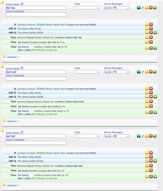 Hei, Ettersom badet er ett rom som kun brukes en viss andel av døgnet ville jeg automatisere dette. Jeg bruker DeConz, med en ikea trådri bevegelsen sensor og ikea trådfri GU10 led pærer. Eventene som er satt opp er som følger: Det jeg kunne ønske meg er muligheten til å enten overstyre replay action, eller bevegelses sensoren. F.eks, hvis jeg på kvelden vil at alle lysene skal skru seg på og bli der f.eks i 30min. Slik som det er i dag vil lysene bli satt ihht de aktuelle eventene umiddelbart når bevegelsen sensoren ser bevegelse. Er det i det hele tatt mulig med utvalget av event "kontroll" som er innebygget i HS3 å oppnå dette uten bruk av 3de part plugin som f.eks easy trigger? Jeg kan også styre lyste via pad manuelt via imperiHome om det gir noen flere muligheter. Tips tas mot med takk