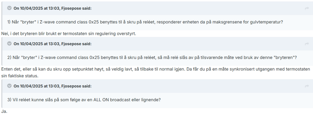 Hei Thermofloor, jeg tenker at det ville vært fint å få avklaring på mine spørsmål/påstander: 1) Når "bryter" i Z-wave command class 0x25 benyttes til å skru på reléet, responderer enheten da på maksgrensene for gulvtemperatur? 2) Når "bryter" i Z-wave command class 0x25 benyttes til å skru på reléet, så må relé slås av på tilsvarende måte ved bruk av denne "bryteren"? 3) Vil reléet kunne slås på som følge av en ALL ON broadcast eller lignende?