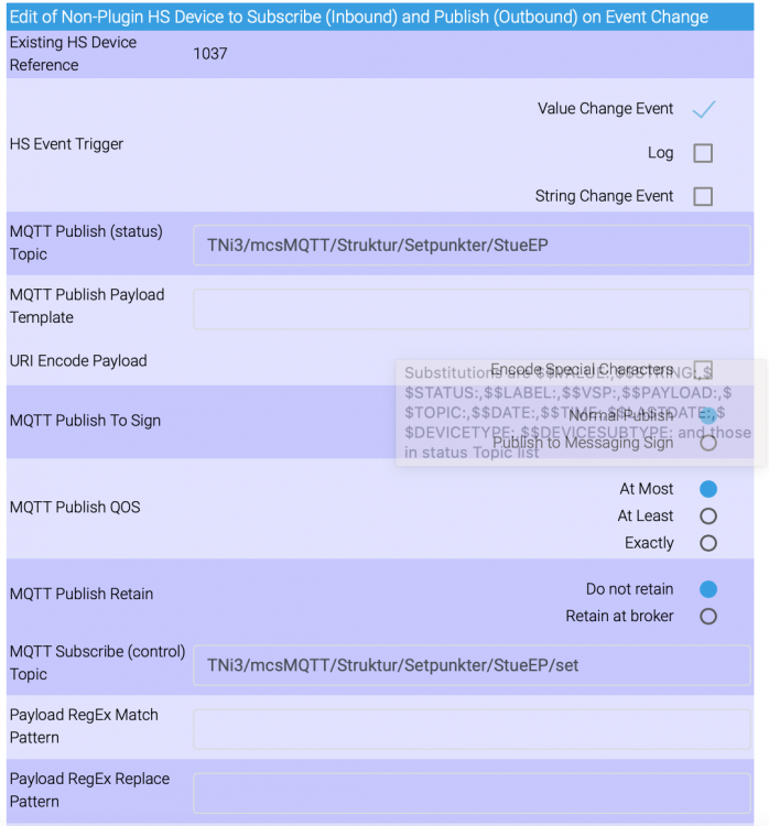 Jo, men! Ut av mcsMQTT så har det aldri vært et problem, det er på turen inn, altså de topics som jeg subscriber på som skaper trøbbel. Hva er det mcsMQTT-forventer å få inn...er det value eller status. Det jeg tenker at at den kanskje mottar noe som ikke "trigger" oppdatering av VD? Hvordan substituter man value-til-status og status-til-value? Vet at man må knotte noen greier med dollartegn, men har ikke helt skjønt greia enda...