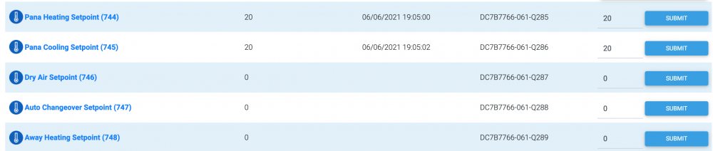 Jo, men det er ett setpunkt for "Heat" og ett for "Cool". Slik det dette i praksis ser ut til å fungere så må jeg nå legge til ett ekstra sett med setpunkter, samt logikk. Problemet slik jeg nå tolker det er at om jeg "submitter" et setpunt i HS så sier varmepumpa "pip", og basert på om jeg legger verdien inn i "heat" eller "cool" så skifter varmepumpa modus i henhold til dette. Modusknappen synes da ikke å være nødventil til annet enn å skru av varmepumpa. Tidligere kontrollerte jeg gjennom denne: Over streken er direkte kontroll av varmepumpa, mens under så er det smarthuspresets for dag- og natt/borte-innstillinger. Det som ble sendt over var setpunkt(modus-agnostisk), viftehastighet og modus. Jeg kunne ønske å bruke samme tilnærming nå, men det virker ikke mulig uten en "driver"...