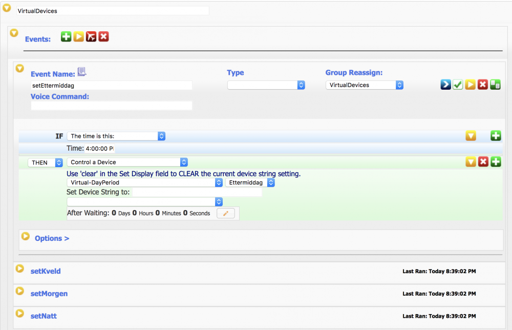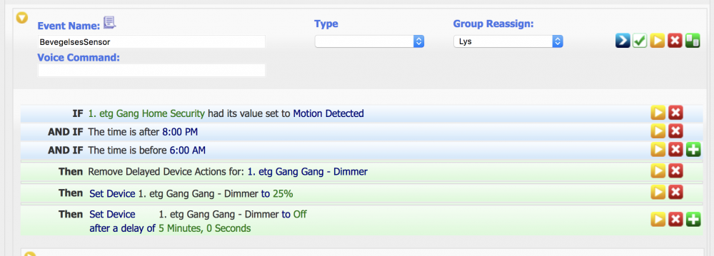 1. La oss si at du har flere eventer, som gjør mye av det samme, - f.eks slår på alle lys i 1. etg med en dimmer setting til 20%. Skulle ønske jeg kunne bare slå på en gruppe med lys, uten å spesifisere hver enkelt, til en dimmersetting som nevnt.