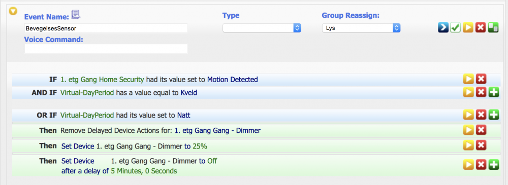 22. Jeg ønsker egentlig eksakt det som er beskrevet her; https://www.hjemmeautomasjon.no/forums/topic/978-homeseer-skolen-7-events-automatikkens-kjerne/?tab=comments#comment-10237 At et lys skal komme på, og være på så lenge der er bevegelse i rommet. Jeg har så og si kopiert oppsettet i linken over, men den slår seg uansett av etter 2 min, uavhengig om det er bevegelse i rommet eller ikke. a) Ser du feilen? b) Et spm på siden, - det virker som det tar en liten tid før denne bevegelsessensoren er "klar for å motta bevegelser" igjen. Er det en slags timeout her?