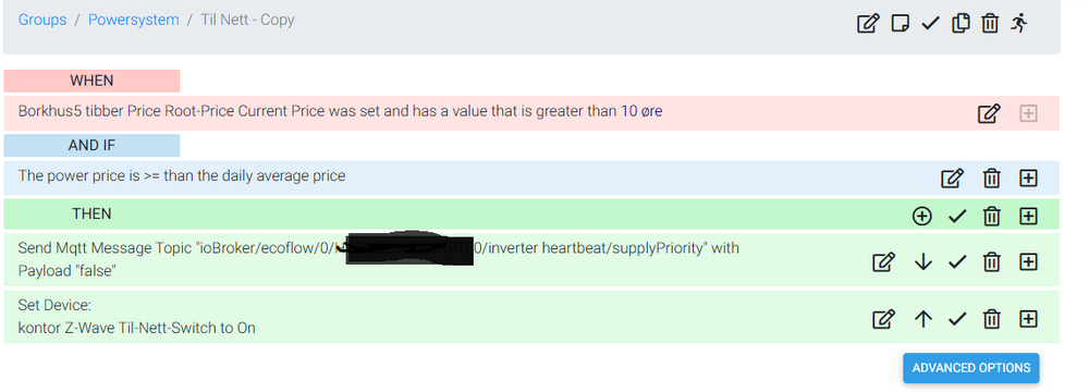 Prissammenligning i Events funker ikke. Når strømprisen er mindre enn 10 øre ønsker jeg ikke at event'en som styrer strøm til nettet(fra batteribank) skal trigges. Imidlertid funker dette ikke, da eventet kjører på selv om strømprisen er nå 4 øre kilowatten. Denne funker ikke: B8 tibber Price Root-Price Current Price was set and has a value that is greater than 10 øre Kjører selv om current price er 4 øre. Screenshot i vedlagt fil.