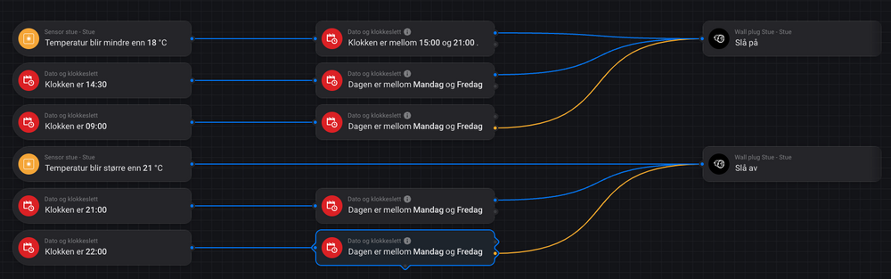 Har du advanced flow tilgjengelig på Homeyen din? Og hva ønsker du å oppnå? Skal du slå på strømmen på de to stikkene når temperaturen går under en terskel, og så slå av igjen når den går over en annen terskel? Her er min flow for komforttemperatur i stuen: Den styres på tid og på temperatur. Og så kan kortene som brukes som "AND"-statement trigge på "true" (blå) eller "untrue" (gul).