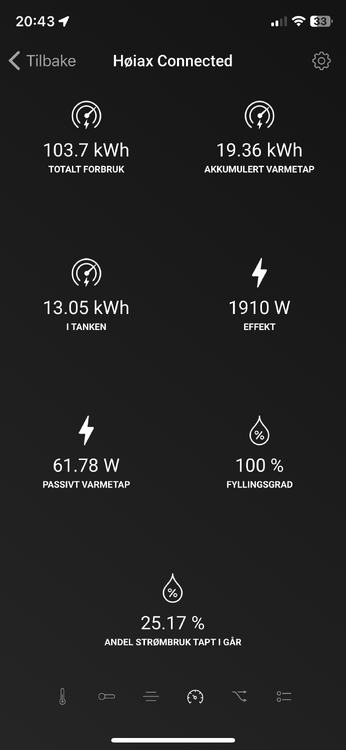 Dette er skjernbildet med info man får på Homey. Foreløpig har jeg bare satt min til Høiax’ egen styring på spotpris. Kjapt overslag viser for øvrig at forbruket ligger ca 1,2 kWh lavere per døgn enn på den gamle Oso’en.