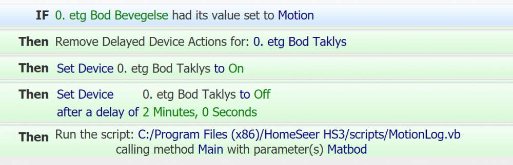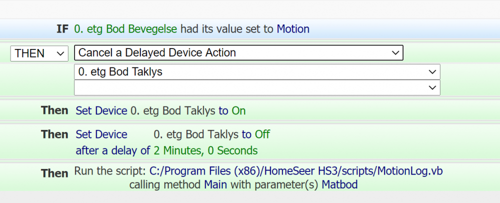 2. Den må ikke det. Den må bare stå foran action'en som er "delayed". Gjorde det? Det skal ikke ha noe å si. Men jeg stusser på en ting: Du fjerner "Delayed Actions" for "Sensor Binary", men skrur på og av "PWR Garderobe"? Stemmer det?