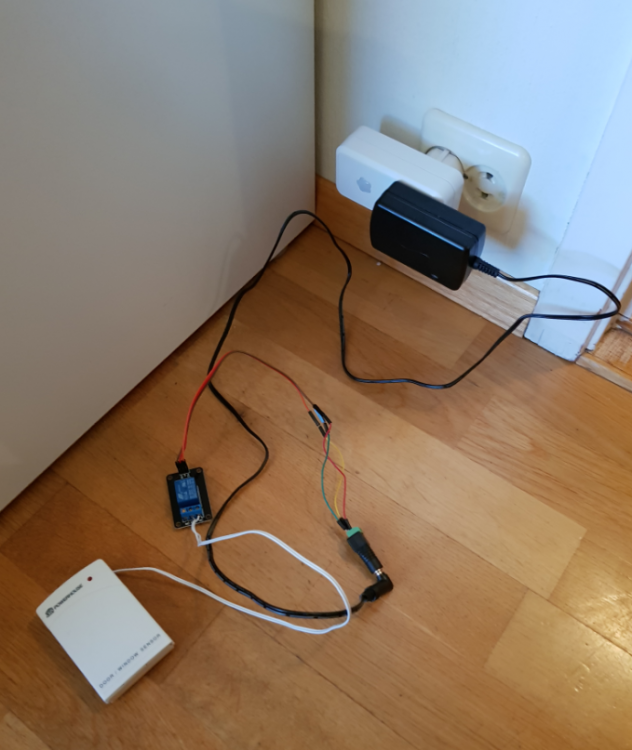 Jeg ble lovet dyrt og hellig fra tre forskjellige instanser av support og montører av Verisure, at "hey, det er ikke noe problem! Vi har en magnetkontakt som kan brukes til å sende signaler når alarmen går på eller av". "Godt", tenkte jeg, "få Verisure i hus". De var også billigere enn alternativer av ukjente årsaker. Montør dukker først opp med alle sensorer, skrur ned den gamle alarmen og får den nye på plass. Men magnetkontakten hadde han ikke med. Han kom tilbake i forrige uke. Vi fikk til å lese fra den, men ikke sende signaler. Etter to-tre telefonsamtaler høyere og høyere opp i support-systemet viste deg seg at det ikke var mulig. Selvfølgelig. (Hadde jo en mistanke om det, for hvordan skal en sensor plutselig bli en sender?) Vel, alternativet ble en Verisure On/Off-modul, en 3V strømforsyning og et relé. Ikke pent, men det fungerer. Det som er mest synd er at den ikke kobler til reléet før alarmen faktisk er PÅ (dvs. inkludert 45 sekunders "leaving home" tid, der var den gamle "analoge" NorAlarm-boksen MYE bedre). Men det blir lyst med en gang døra går opp.