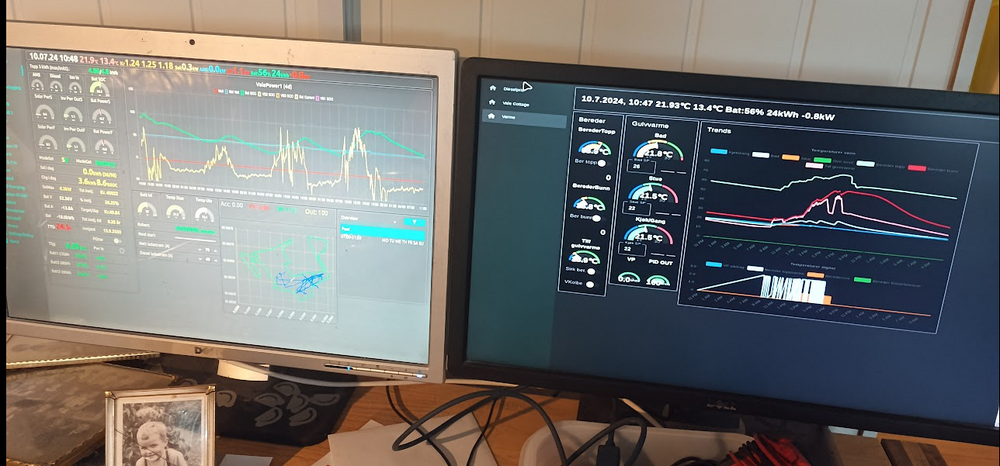 17. Ja. Maskinen som tidligere kun kjørte Linux Mint med 2 skjermer for visualisering av hjemmeautomasjonen har nå fått Proxmox i tillegg og da mistet jeg skjermoppløsningen på ene skjermen. Denne konfigurasjonen er egentlig provisorisk da jeg akkurat nå har manko på en PC men hadde håpet å kunne beholde full funksjonalitet fra tidligere i tillegg til Proxmox. Venstre skjerm kjører Node-RED Dashboard i 1920x1080 mens høyre kjører Node-RED Dashboard 2.0/Flowfuse i 1024x768 med en god del zoom for å bli noenlunde riktig proporsjonert: Bruker VNC på alle maskinene i nettet mitt men akkurat denne har og må ha 2 fysiske skjermer tilkoblet.