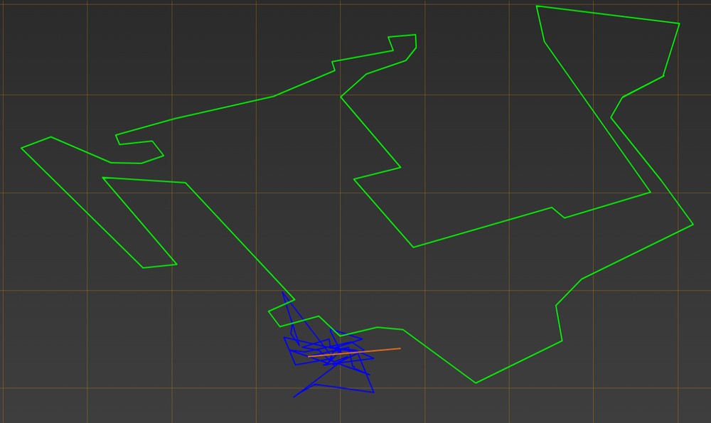 2. Ja, jeg har tenkt den tanken også. Det ene sub-området, som er viktig å holde pent, er ca 85 m2 og nokså enkel fasong. Hadde nesten kjøpt en ganske rimelig mellomklassemodell ikke langt unna i går men en annen var litt kjappere enn meg... Ser en del av kantledningmodellene ikke bruker guideledning og det kan gi en lang kjøretur til ladestasjonen. En veldig grov oversikt over plenen ser slik ut. Blå strek er klippersporet (står i ladestasjon nå). 85m2 plenen med lang korridor er til høyre og den mindre viktige 60m2 plenen er til venstre. Kantledningen er en smule mer komplisert da den i nedre del av hagen går rundt en del bærbusker så det blir en lang vei å gå om kantledningen skal følges til 85m2 plenen: